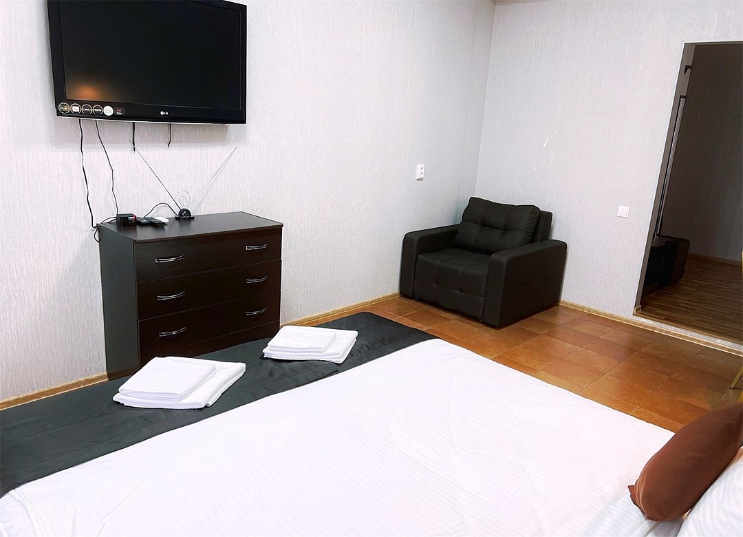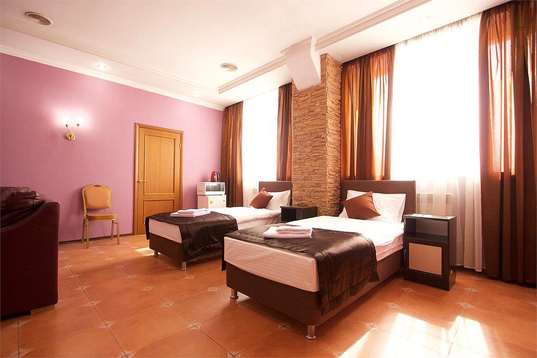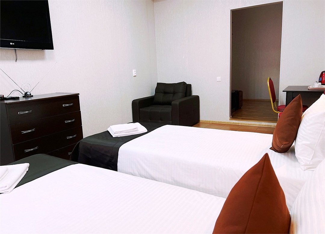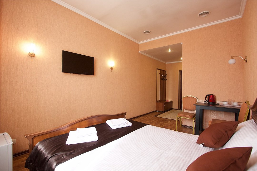 Двухместный номер повышенной комфортности. Две односпальные или одна двуспальная кровать, кресло-кровать, телевизор с плоским экраном, холодильник, кондиционер, Wi-Fi , собственный туалет и душ, электрический чайник, фен, средства личной гигиены, тапочки, доставка питания в номер. Размещение: 1-местное, 2-местное Дополнительное спальное место: кресло-кровать Дети до 12 лет, без предоставления дополнительного спального места, проживают в номере - бесплатно.Услуги и удобства