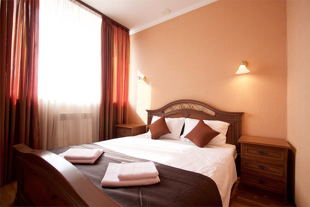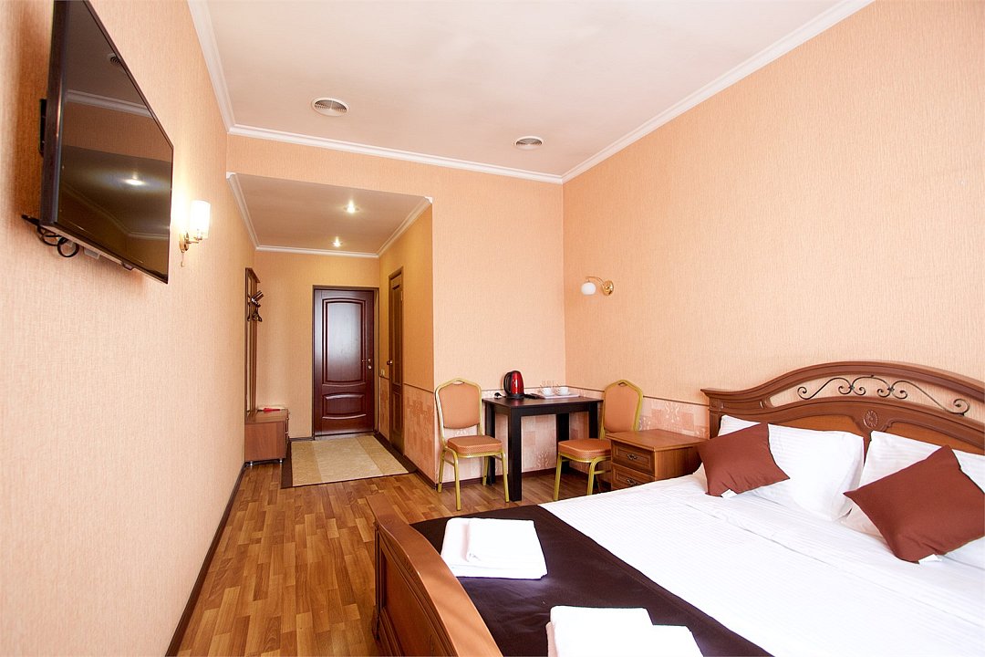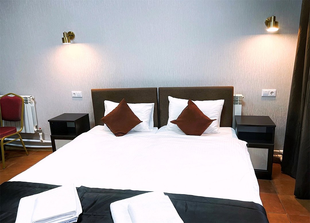 Двухместный номер повышенной комфортности. Двуспальная кровать, телевизор с плоским экраном, холодильник, кондиционер, Wi-Fi , собственный туалет и душ, электрический чайник, фен, средства личной гигиены, тапочки, доставка питания в номер. Размещение: 1-местное, 2-местное Дети до 12 лет, без предоставления дополнительного спального места, проживают в номере - бесплатно.Услуги и удобства