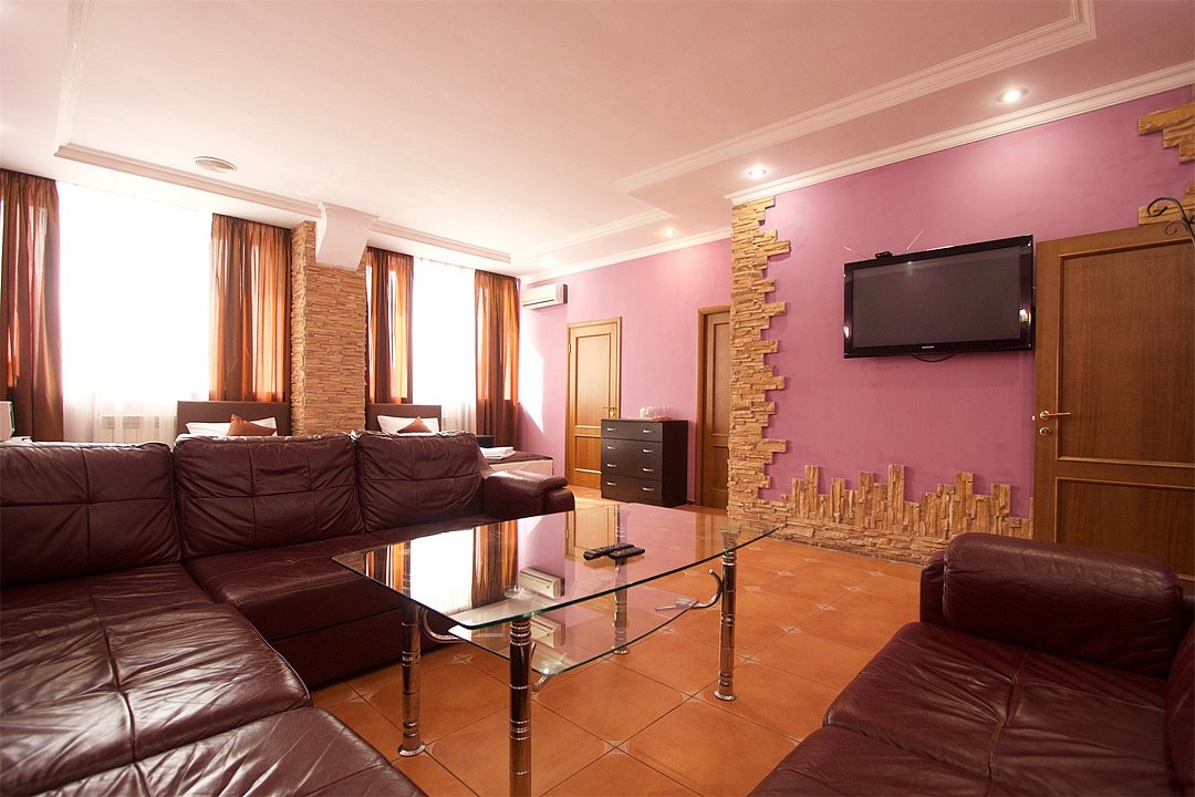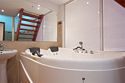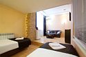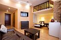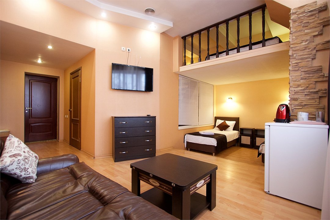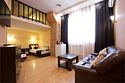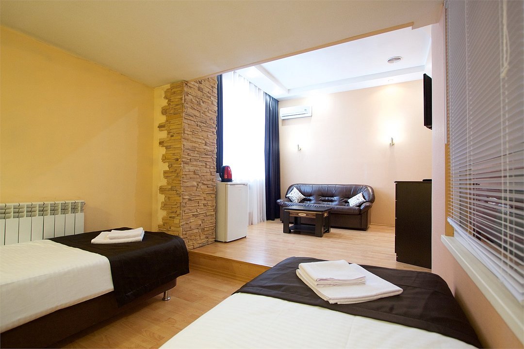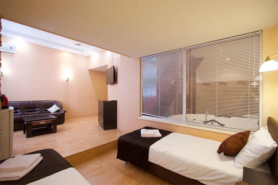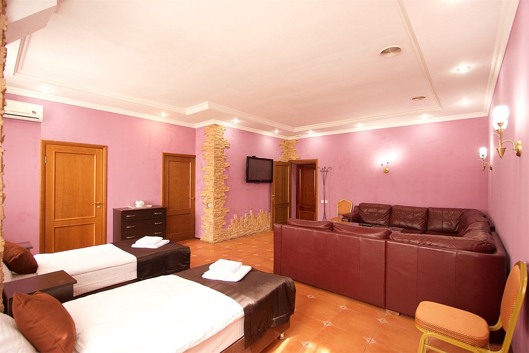 Четырехместный двухуровневый номер с гидромассажной ванной повышенной комфортности. Трансформация кроватей на выбор: 2 двуспальные кровати или 1 двуспальная и 2 раздельные кровати, раскладывающийся диван, телевизор с плоским экраном, холодильник, кондиционер,Wi-Fi , собственный туалет и душ, гидромассажная ванна, электрический чайник, микроволновая печь, фен, средства личной гигиены, тапочки, доставка питания в номер. Размещение: 1-местное, 2-местное, 3-местное, 4-местное Дополнительное (пятое) спальное место: раскладывающийся диван (1000,00 руб) Дети до 12 лет, без предоставления дополнительного спального места, проживают в номере - бесплатно.Услуги и удобства