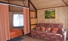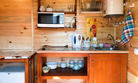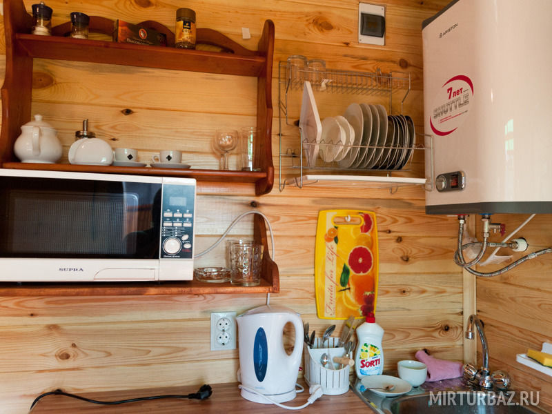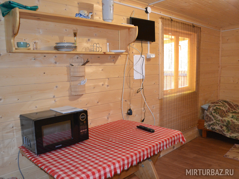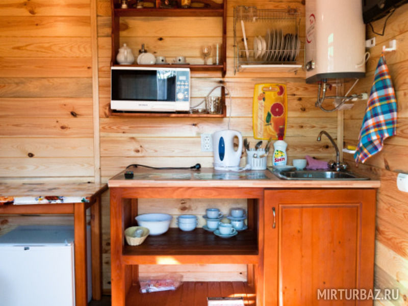1 этаж: крытая веранда, гостиная, совмещенная с кухней, полностью оборудованной для самостоятельного приготовления пищи (холодильник, газовая плита, микроволновка, наборы посуды), телевизор, туалетная комната (душевая кабина, раковина для умывания, санузел), 2 спальни.