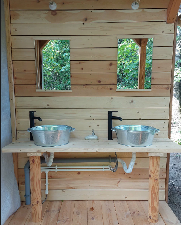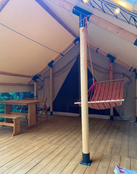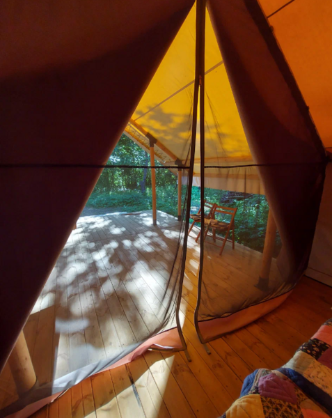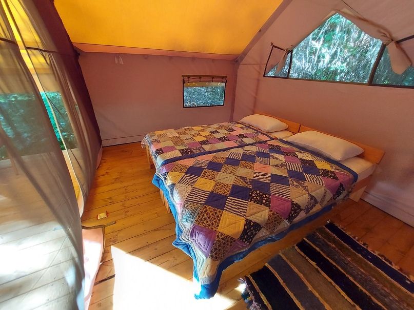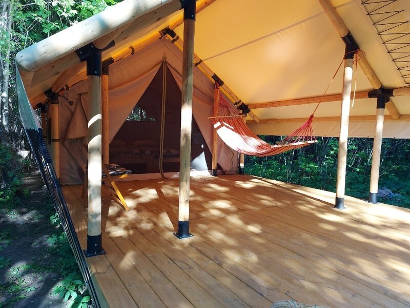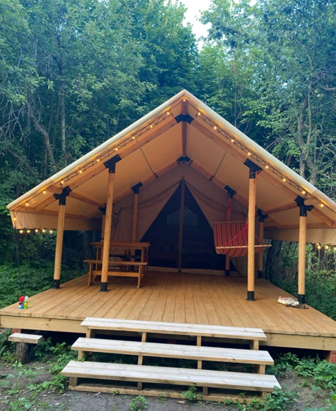 Летний шатер — это просторная палатка с террасой для отдыха в тени деревьев в сочетании с комфортом: кровати с удобными матрасами и белоснежным постельным бельем, душ и туалет в минуте ходьбы от шатра.