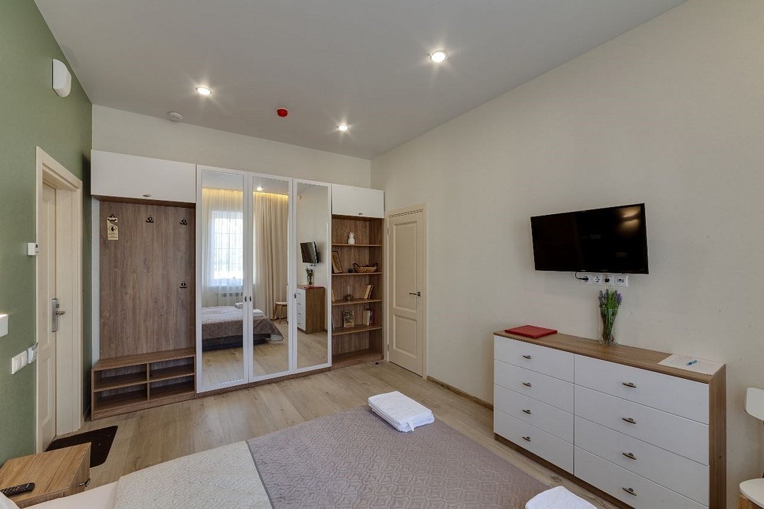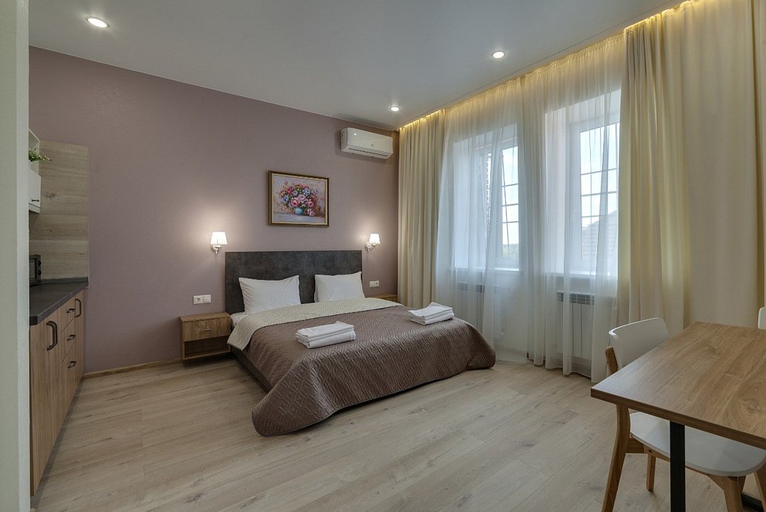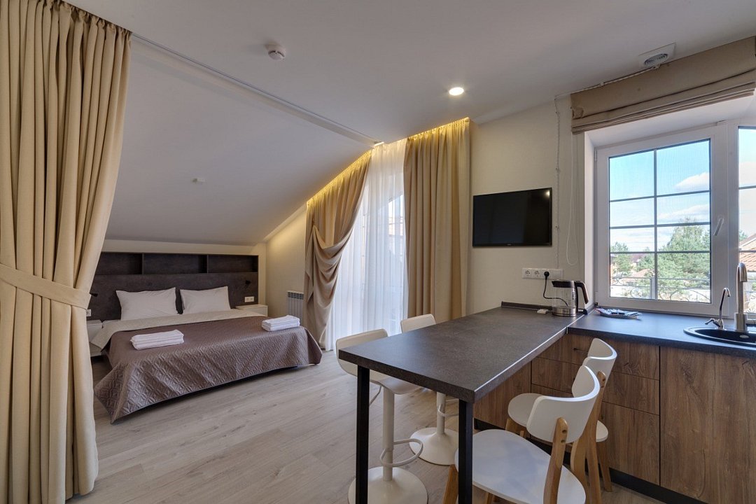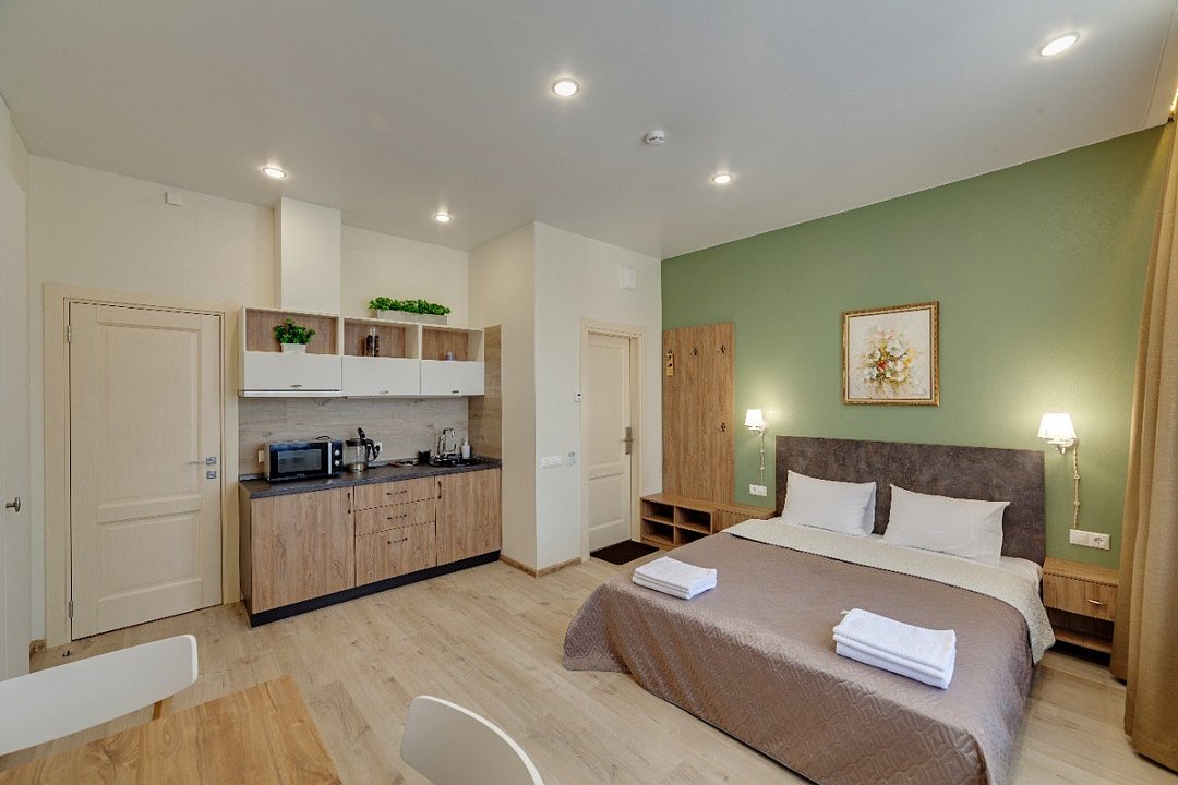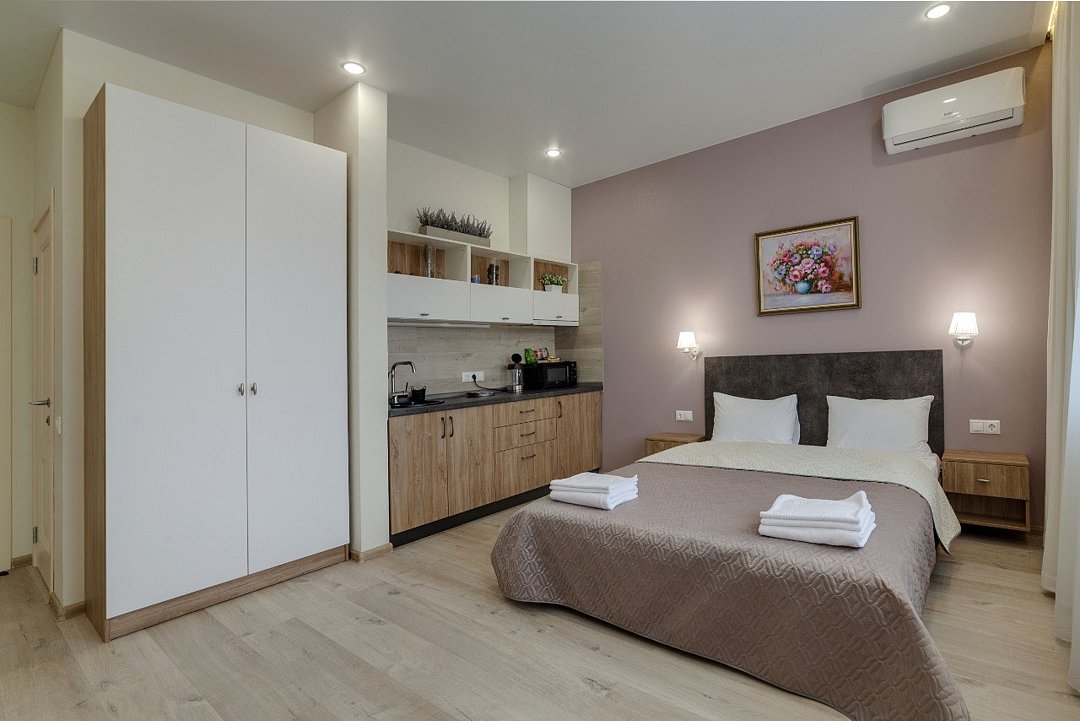 ⁃ двуспальная кровать ⁃ туалетная комната с душем ⁃ мини-кухня ⁃ обеденный стол ⁃ телевизор ⁃ кондиционер ⁃ номер подключён к системе «умный дом»Услуги и удобства