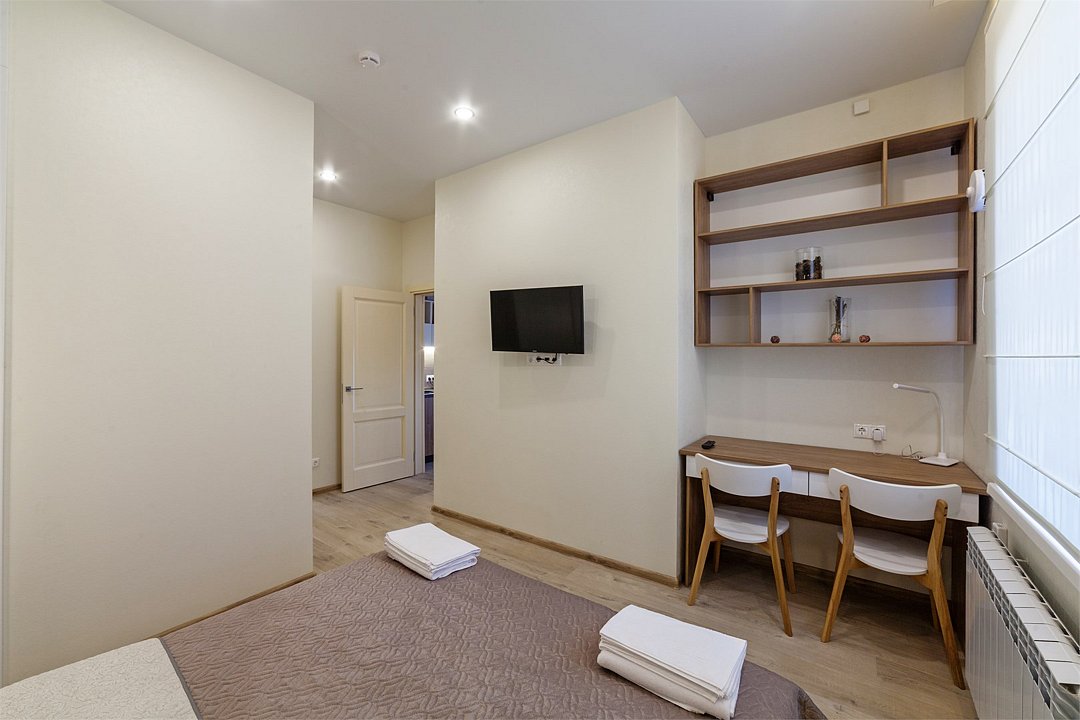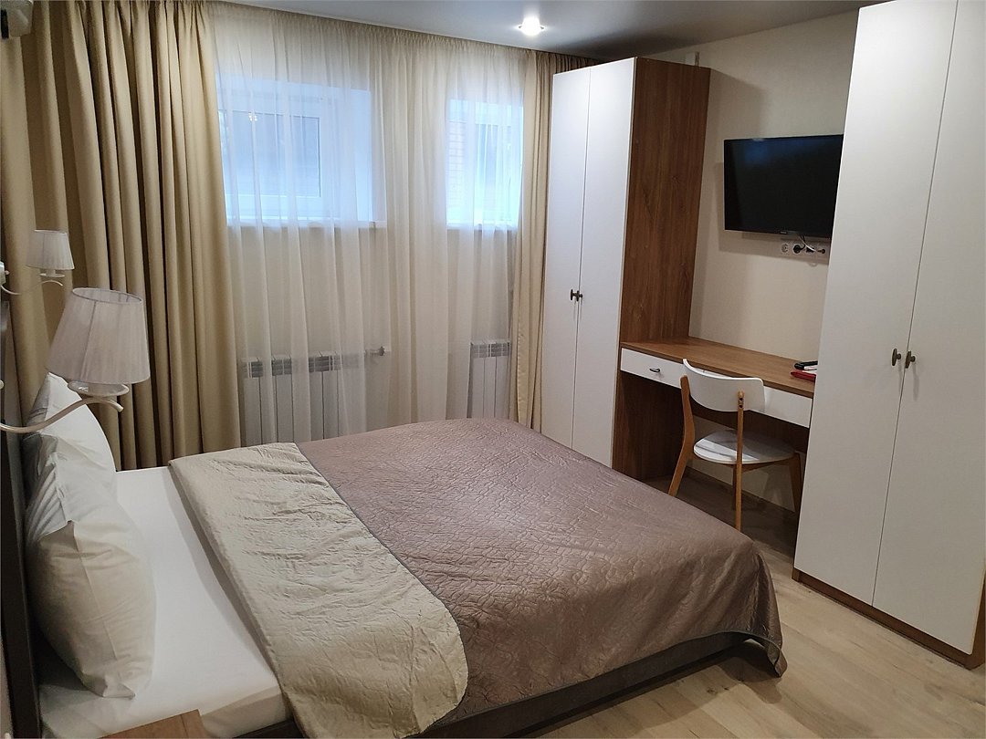 Wi-Fi, холодильник, кондиционер, фен, электронные замки, микроволновая печь, теплый пол, халаты, тапочки, двуспальная кровать, тумбы, стулья, шкаф для одежды, вешалки, письменный стол, зеркало, две комнаты, чайник, питьевая вода, отопление, душ, вид во двор, стол, тумба, туалетные средства, туалет, цифровое тв, диван-кровать, мини-кухня, москитная сетка, телевизор со Smart TV, теплые полы, номер для некурящих, система умный дом, фумигаторВ гостиничном номере