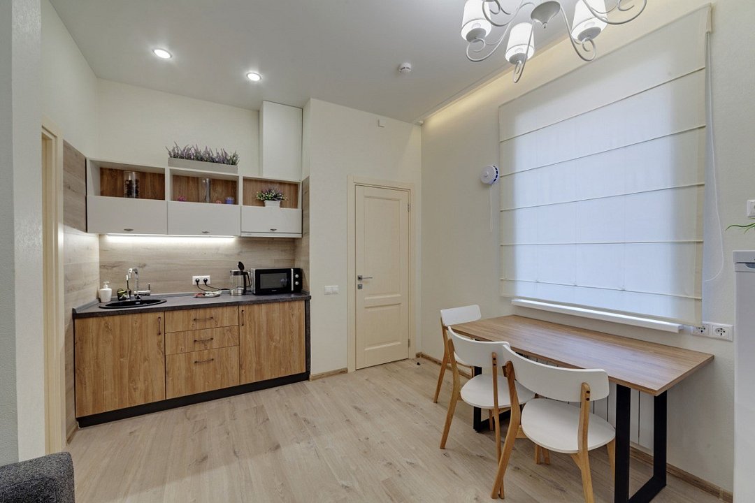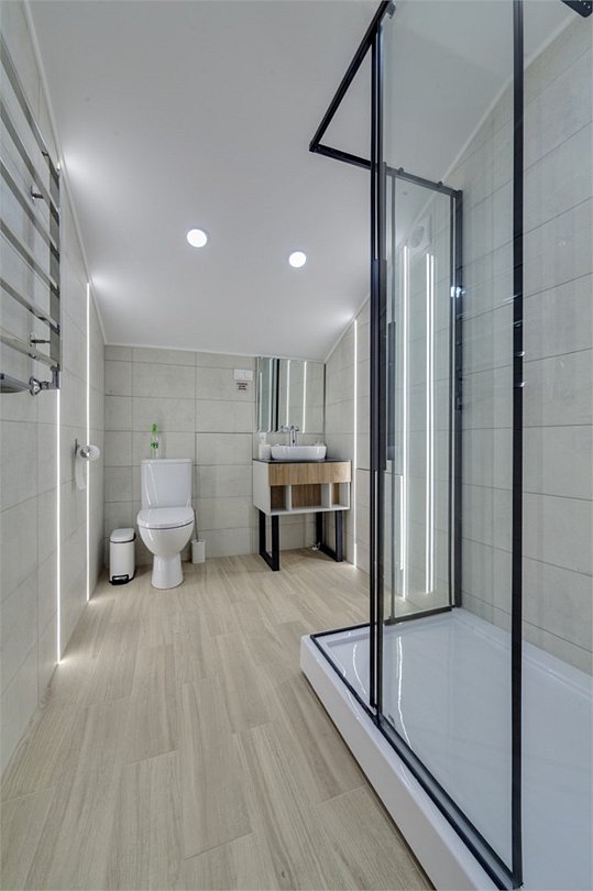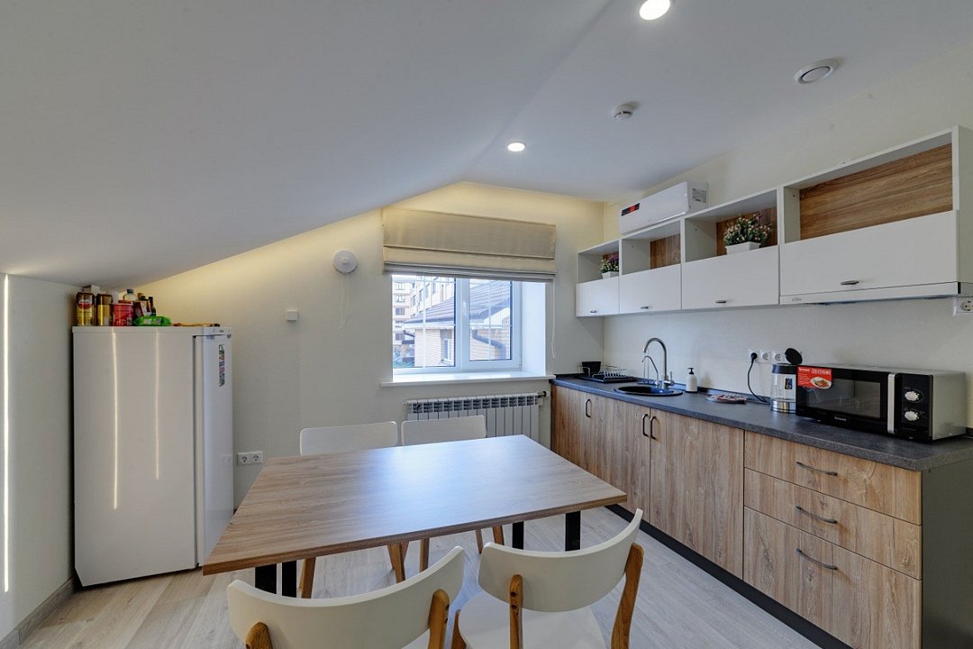 Wi-Fi, кондиционер, фен, электронные замки, микроволновая печь, душевая кабина, теплый пол, халаты, банные полотенца, тапочки, кровать «King size», шкаф для одежды, вешалки, обеденный стол, зеркало, кухня, набор посуды, чайник, унитаз, раковина, питьевая вода, вид во двор, стаканы, кухонная утварь, столовые приборы, стул, тумба, туалетные средства, туалет, мини-холодильник, москитная сетка, телевизор со Smart TV, теплые полы, номер для некурящих, холодильный шкаф, система умный домВ гостиничном номере