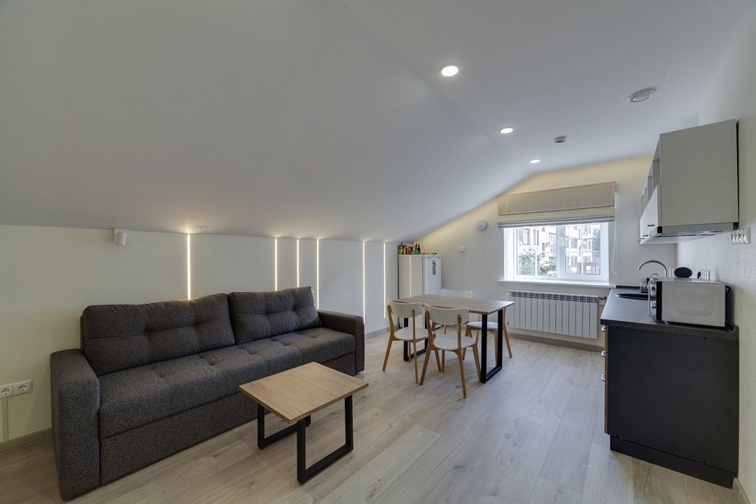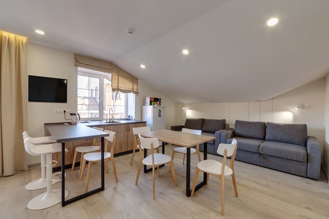 ⁃ размещение до 6 человек ⁃ туалетная комната с ванной ⁃ двуспальная кровать за шторой ⁃ 2 раскладных дивана ⁃ обеденный стол ⁃ мини-кухня - барная стойка ⁃ балкон - санузел ⁃ телевизор ⁃ кондиционер ⁃ номер подключён к системе «умный дом»Услуги и удобства