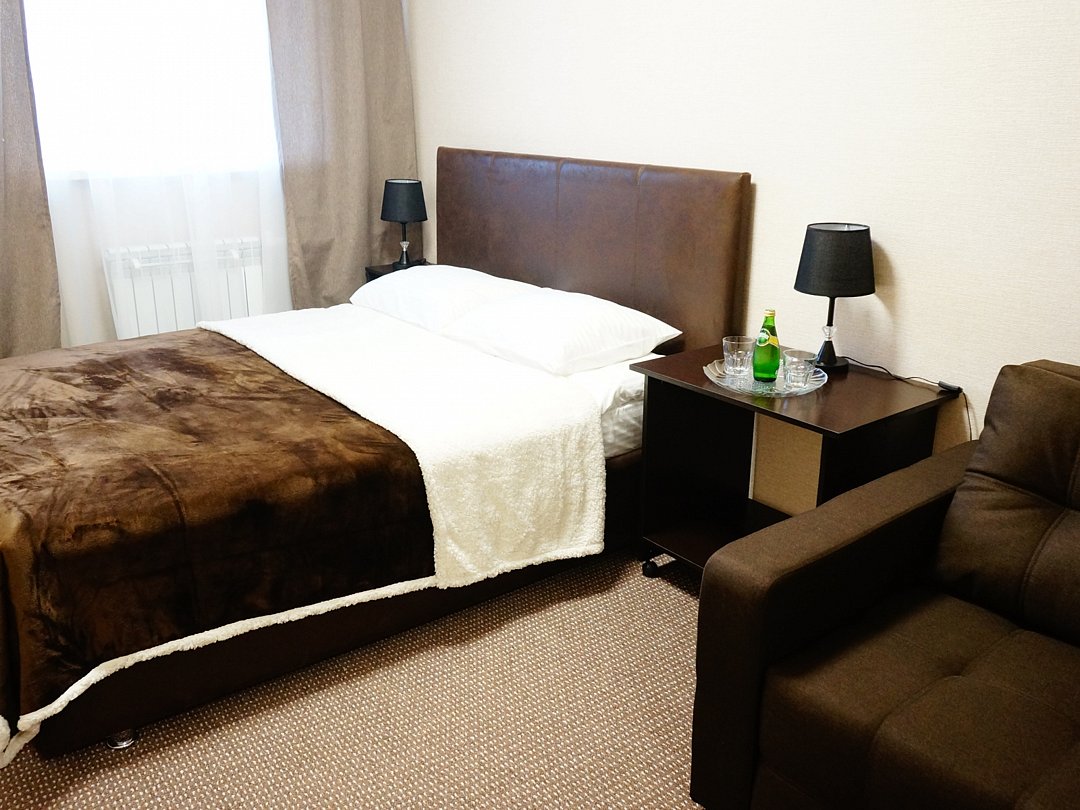 Уютный номер однокомнатный площадью 12 кв.м,с видом во двор. Идеально подходит для размещения 1 человека. Имеет уютную спальню с приятным интерьером. В номере: 1 двуспальная кровать, телевизор, кондиционер, отопление, вешалка для одежды, антимоскитная сетка, постельное белье, полотенца, журнальный стол. В ванной комнате находится душ, туалет и раковина, халат,тапочки, фен, ванные принадлежности (станок для бритья, шапочка для душа). В стоимость входит: Постельное бельё, WI-Fi бесплатно на всей территории, а также бесплатная, охраняемая парковка.В номере