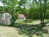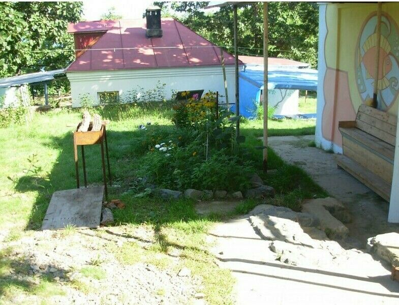 - Возле домика имеется место отдыха с мангалом; вход в дом украшен клумбой с цветами.