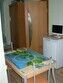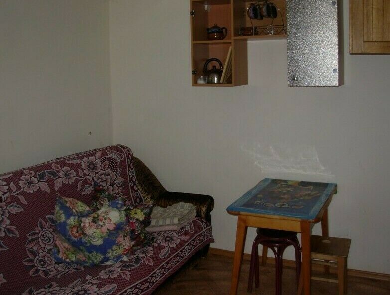 - На первом этаже (14 кв.м.): раскладной диван, холодильник, эл.чайник, чайный сервис, столик, стулья, шкаф для одежды, шкафчик для посуды, туалет, умывальник, душ с холодной и горячей водой; крыльцо (5 кв.м.) со столиком для приготовления пищи и газовой плитой.