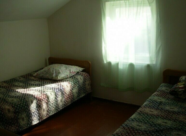 - На втором этаже (9 кв.м.): две односпальные кровати, тумбочка, телевизор, вешалки для одежды.