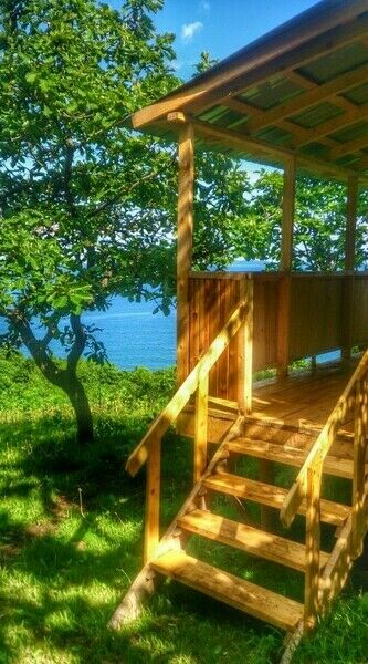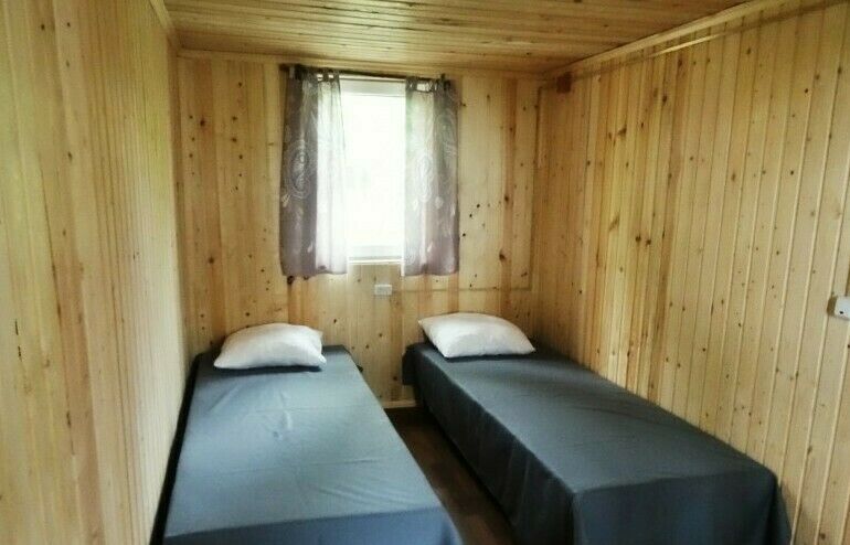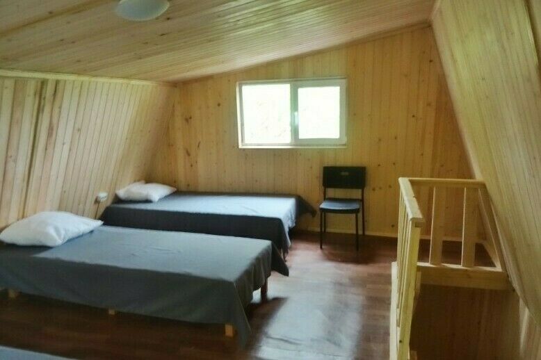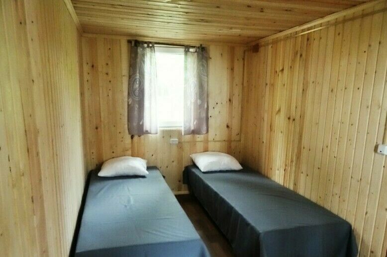 Домики состоят из просторной открытой террасы, кухни-прихожей и двух спальных комнат. Одна спальная комната находится на 1-ом этаже и рассчитана для размещения 2-х человек, вторая спальня расположена на 2-ом этаже и рассчитана для размещения 4-х человек. По Вашему желанию кровати мы можем установить как двуспальные, так и односпальные.