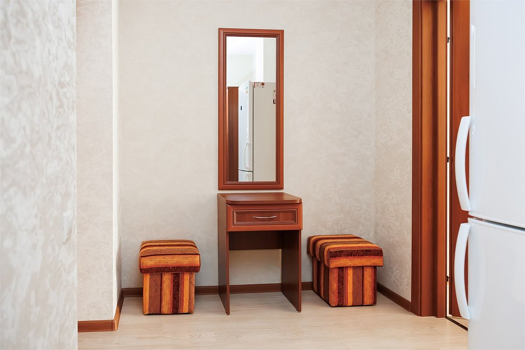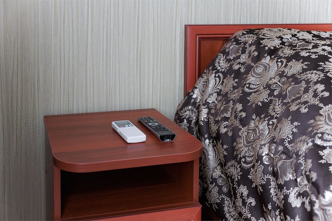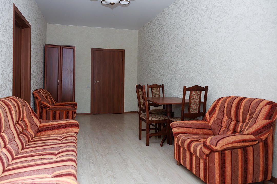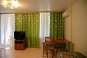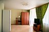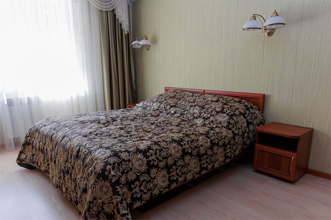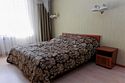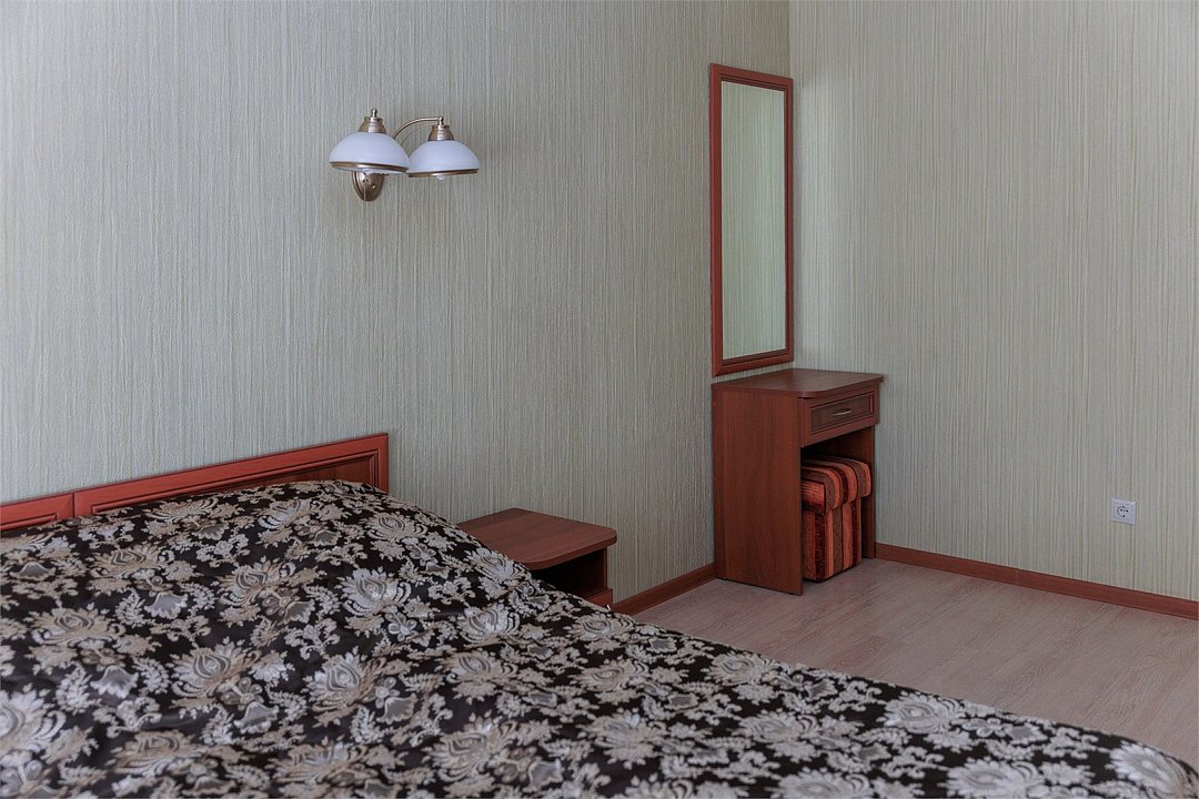 Уютный двухкомнатный номер с одной двуспальной кроватью и мягкой мебелью (диван и два кресла). Номер оснащен всем необходимым для комфортного проживания: прикроватные тумбочки, стол, стулья, шкаф для одежды, туалетный столик с зеркалом, двухкамерный холодильник, кондиционер, 2 телевизора, санузел с душевой кабиной, сушилка для белья, необходимый набор посуды. В номере имеется выход на отдельный балкон с видом на лес.