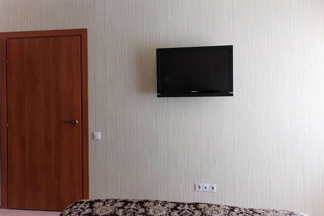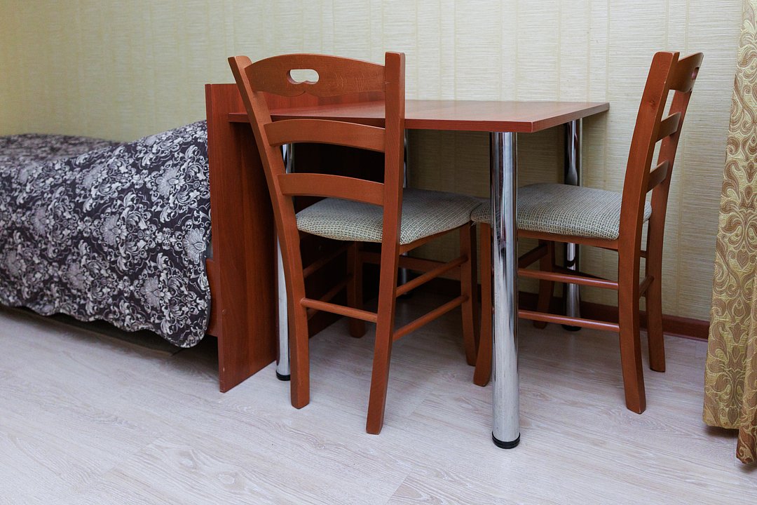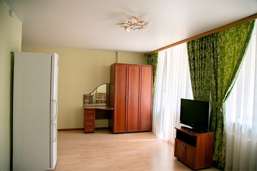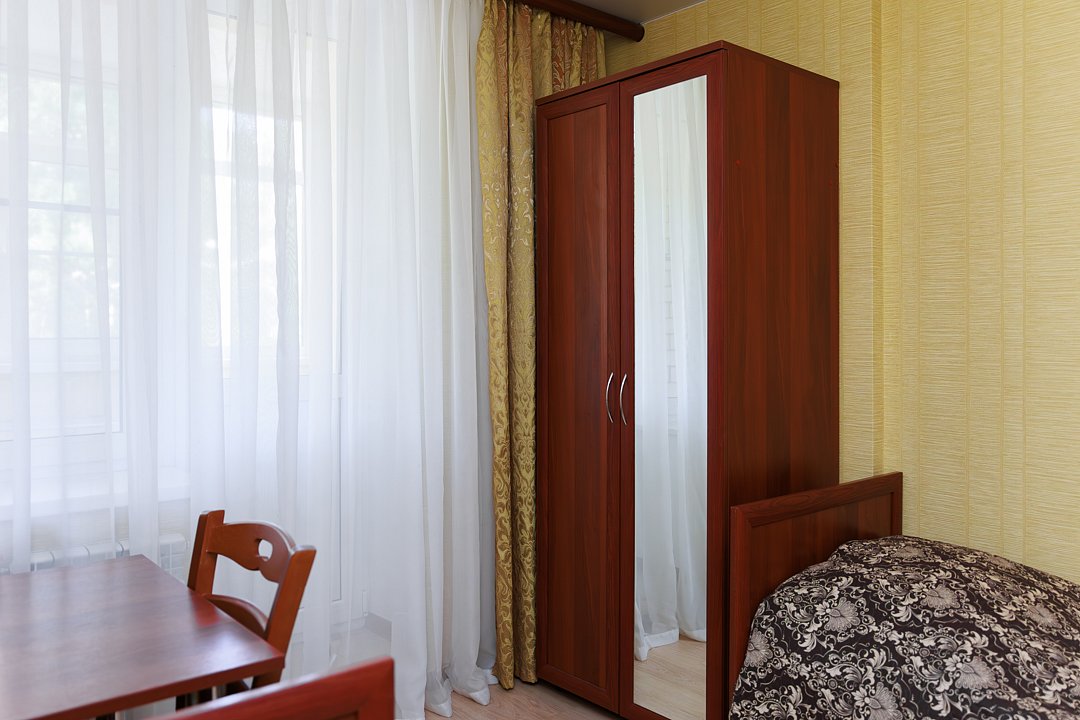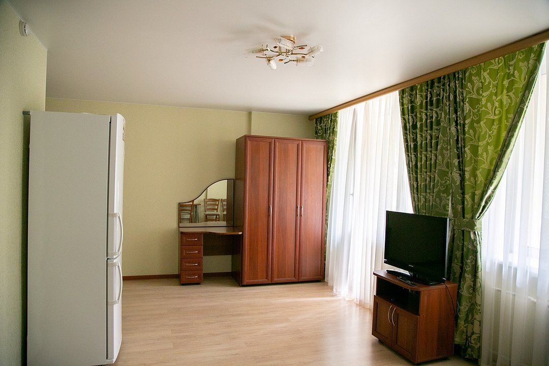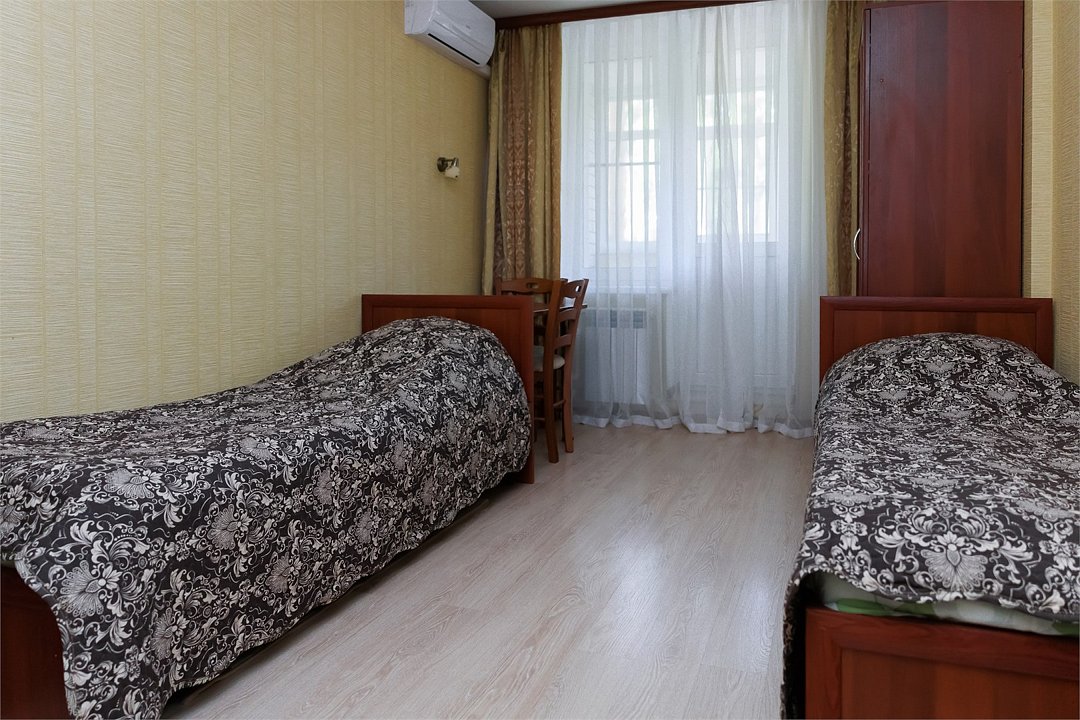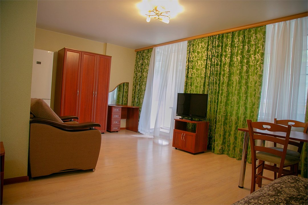 Просторный однокомнатный номер с четырьмя односпальными кроватями (по запросу фиксируются в одну двуспальную). Номер оснащен всем необходимым для комфортного проживания: прикроватные тумбочки, стол, стулья, шкаф для одежды, туалетный столик с зеркалом, двухкамерный холодильник, кондиционер, телевизор, санузел с душевой кабиной, сушилка для белья, необходимый набор посуды. В номере имеется выход на отдельный балкон с видом на лес.