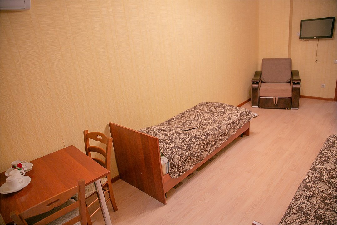 Просторный однокомнатный номер с тремя односпальными кроватями (по запросу фиксируются в одну двуспальную) и одним дополнительным спальным местом (раскладное кресло-кровать). Номер оснащен всем необходимым для комфортного проживания: прикроватные тумбочки, стол, стулья, шкаф для одежды, туалетный столик с зеркалом, двухкамерный холодильник, кондиционер, телевизор, санузел с душевой кабиной, сушилка для белья, необходимый набор посуды. В номере имеется выход на отдельный балкон с видом на лес.