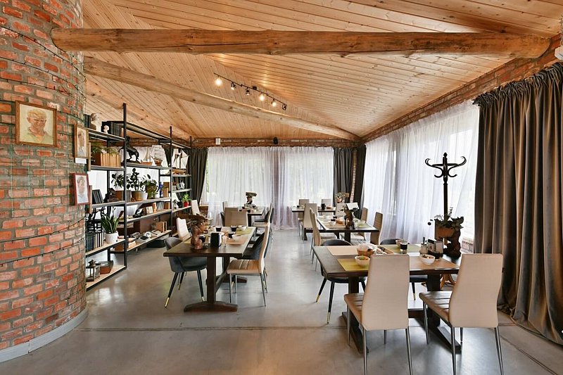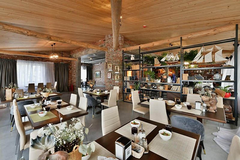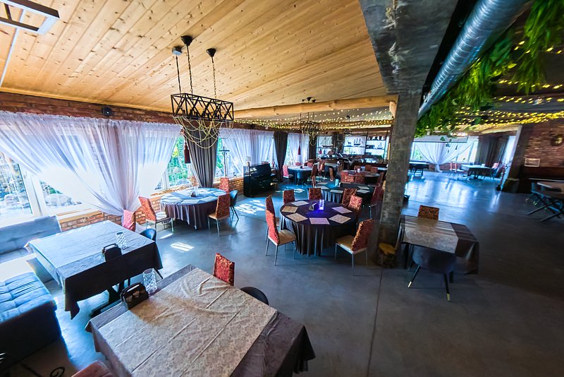 Основной зал ресторана вмещает до 100 гостей. В меню ресторана мясные блюда из продукции собственной фермы, а так же всегда свежайшая рыба утреннего улова.