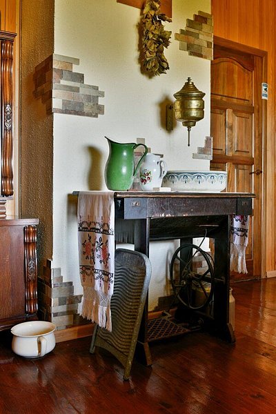 В номере располагается камин, собственный санузел с душевой кабиной и старинной печкой. Спальное место представлено двуспальной кроватью. Номер очень просторный. В номере есть бесплатный WiFi. Вид из окна номера на сад.