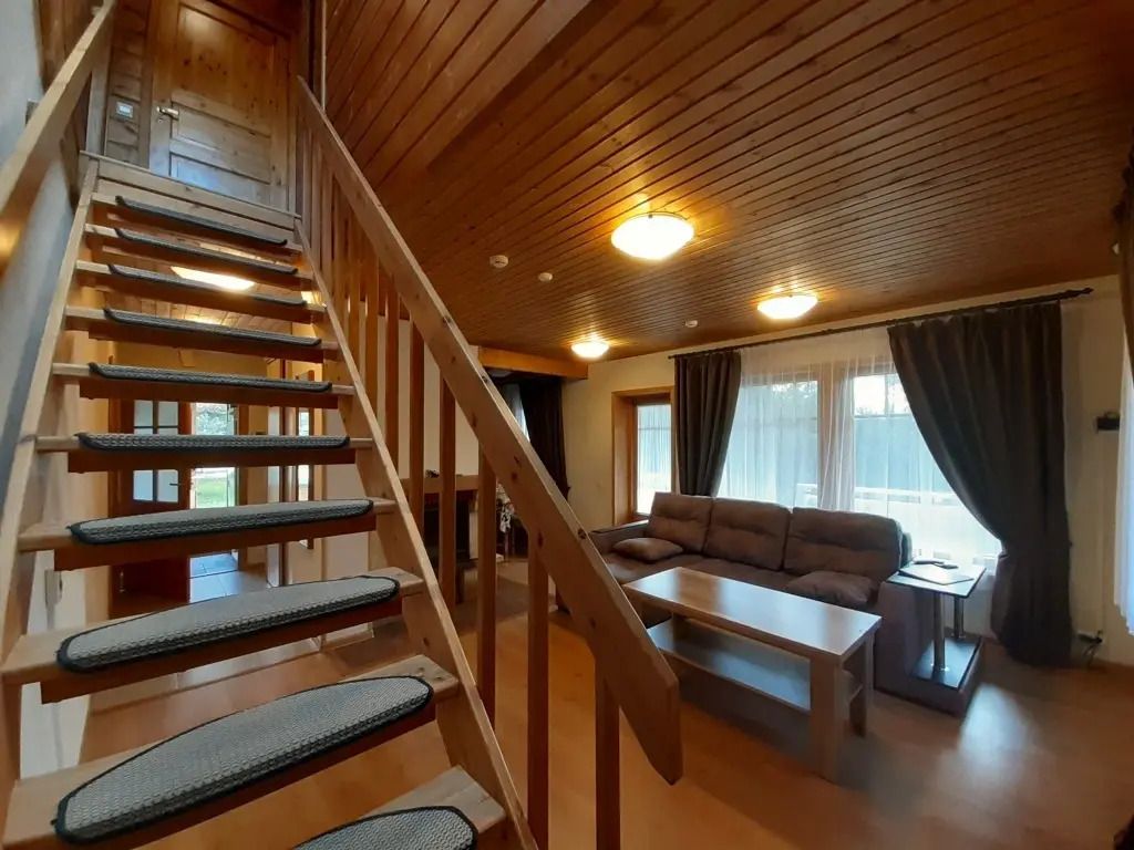 Первый этаж: гостиная с дровяным камином, спальня с двумя односпальными кроватями, кухня - столовая, сушильный шкаф, сауна, санузел с душем.