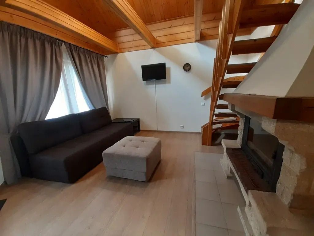 Первый этаж: гостиная с камином, спальня с двумя односпальными кроватями, кухня - столовая, санузел, душ, сауна