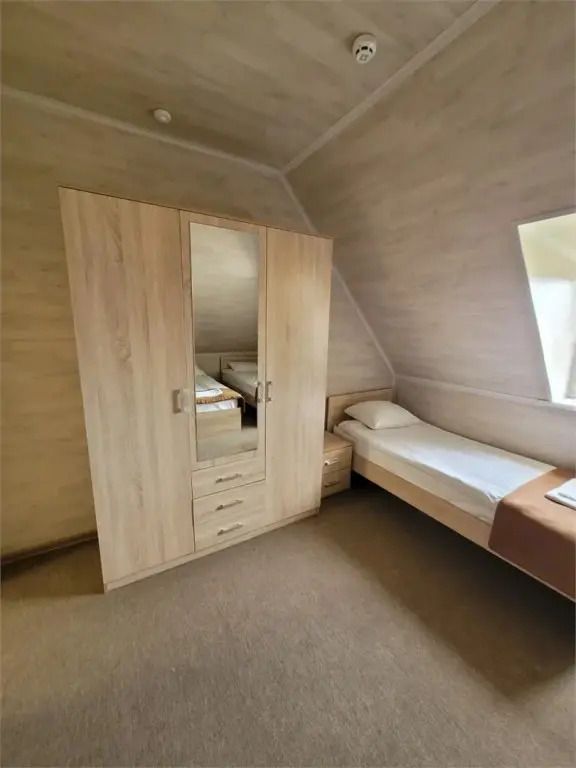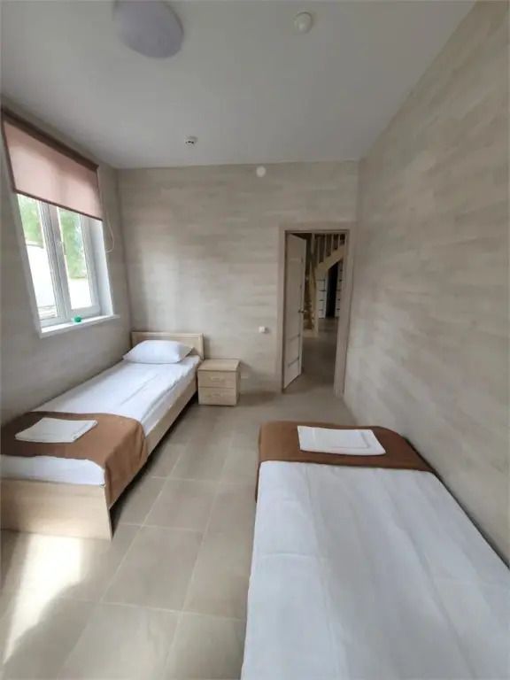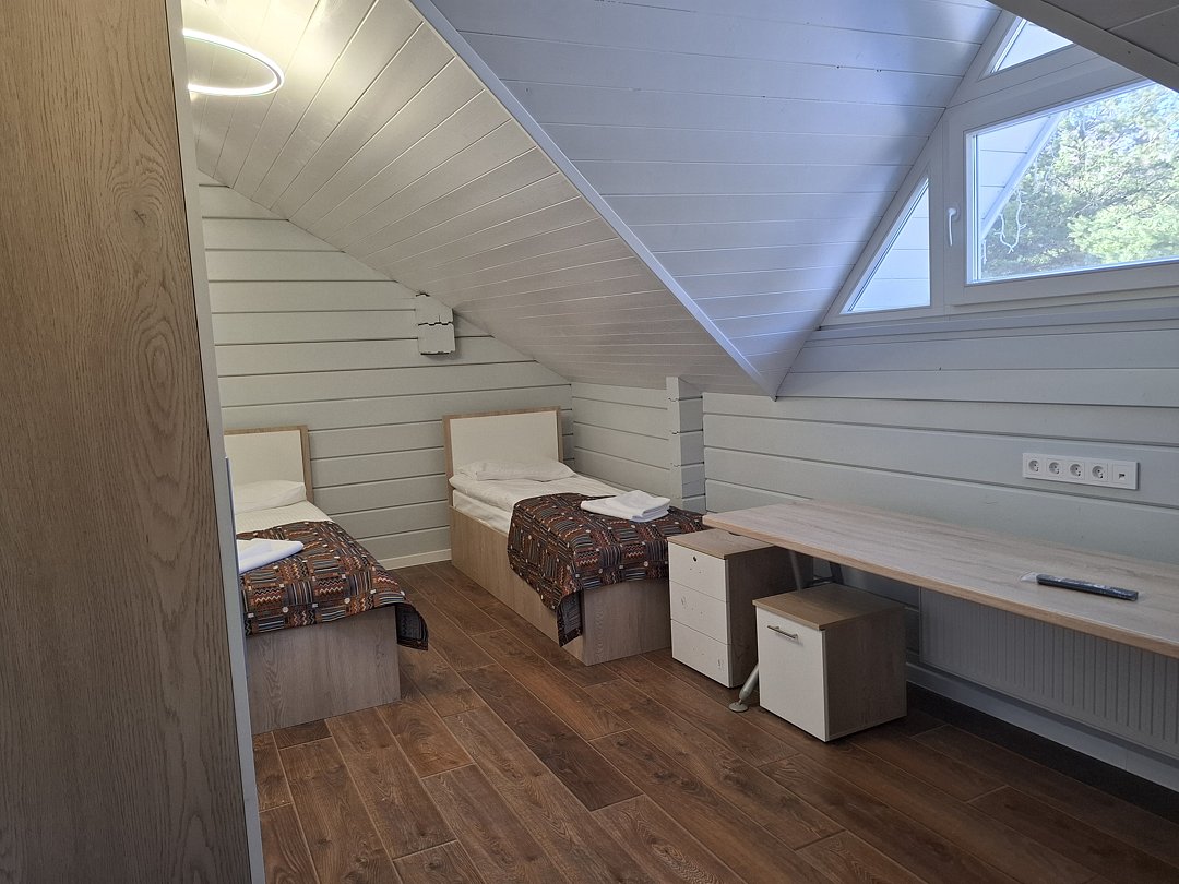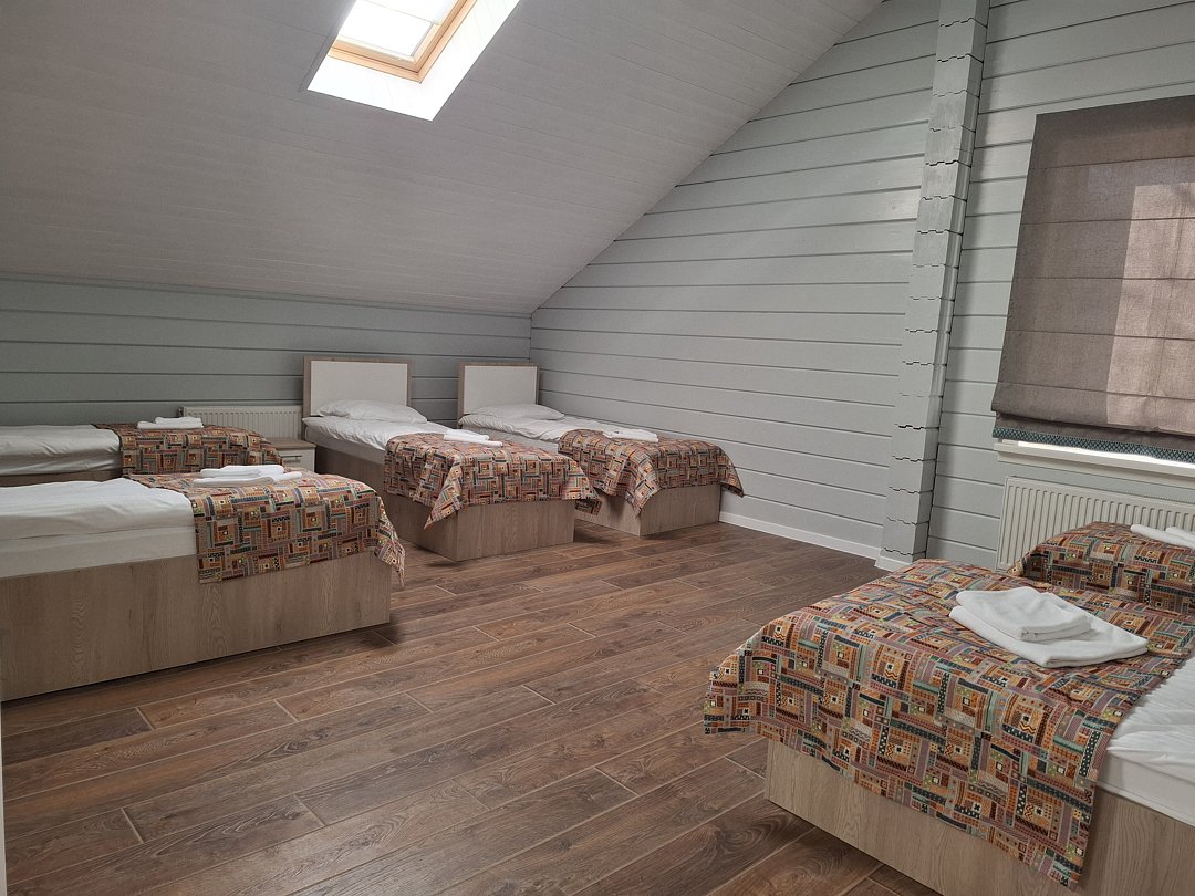 Второй этаж: спальня с 2 односпальными кроватями, телевизором и рабочим столом, спальня с 6 односпальными кроватями, 2 санузла.