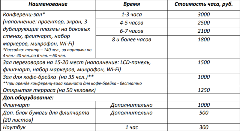 Все залы оснащены современным оборудованием: мультимедийная система, экран, проектор, флип–чарт, бесплатный Wi–Fi.