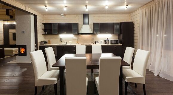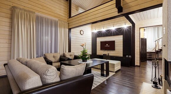 В коттедже имеется большая гостиная с дровяным камином, кухня, оборудованная всей необходимой бытовой техникой, два сан.узла.