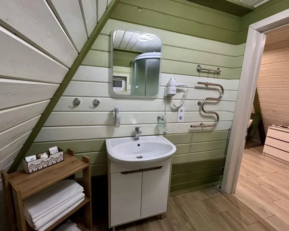 Ванная комната: по 2 полотенца на каждого гостя (банное и для лица), душевой набор на каждого гостя (гель, шампунь, щетка, паста), одноразовые тапочки.