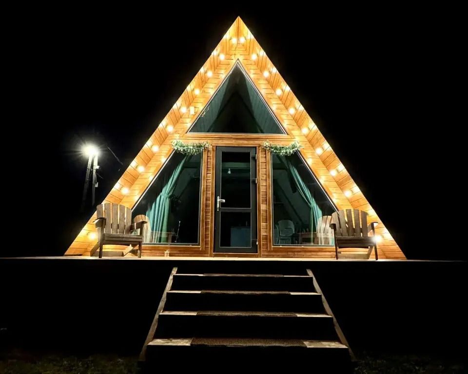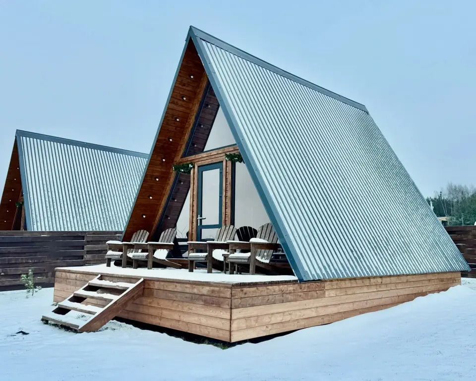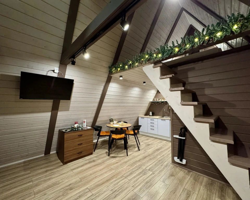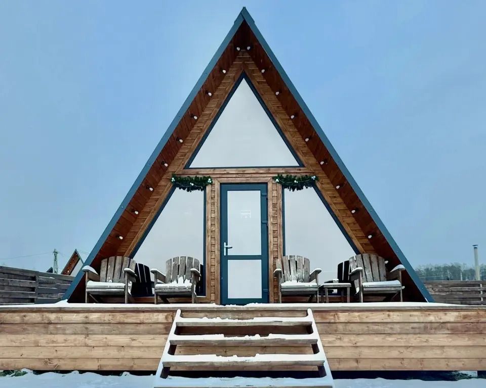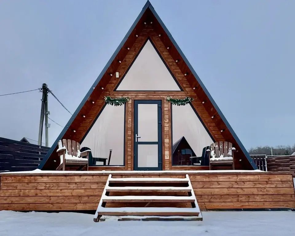 Уютный A-frame с панорамными окнами и современным интерьером в тёмных тонах.