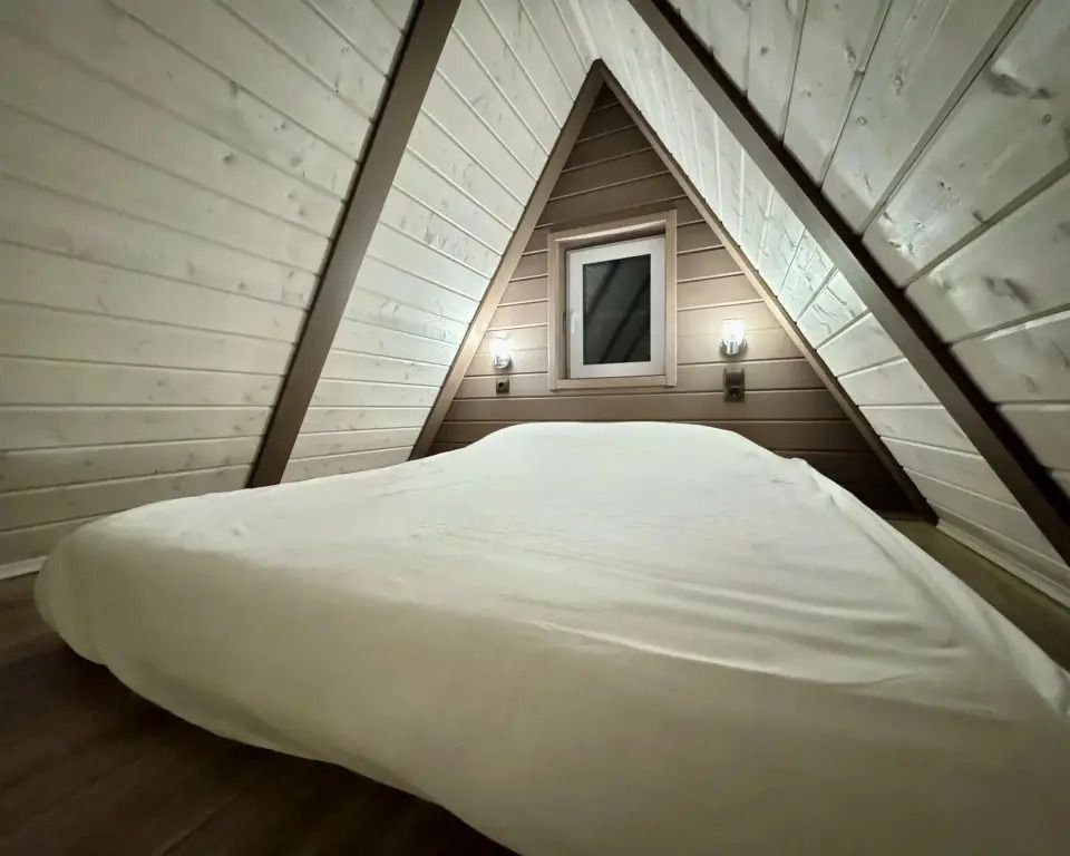 Уютный белый A-frame с панорамными окнами и современным интерьером в светлых тонах.