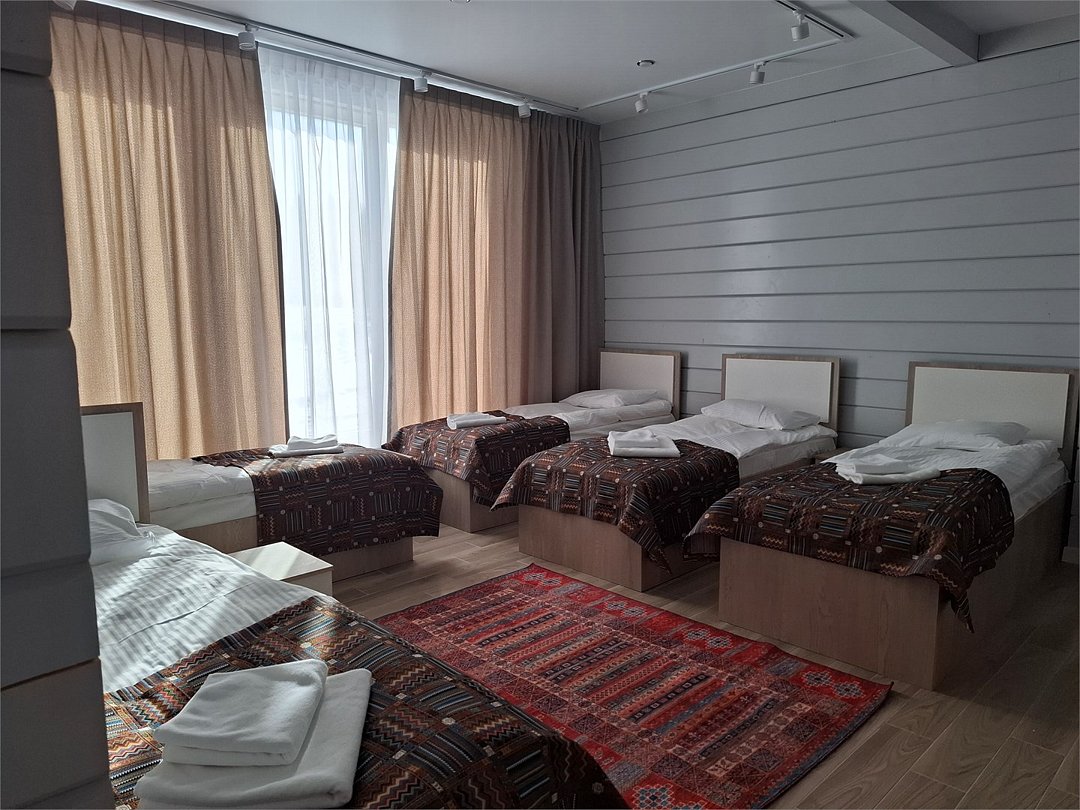 3 односпальные кровати либо двуспальная кровать, кровать "евростандарт",телевизор, стол, стул, шифоньер, электрочайник, чайная посуда, кувшин и стаканы для воды, мини-холодильник, сушилка для белья, ковролиновое покрытие пола.Услуги и удобства