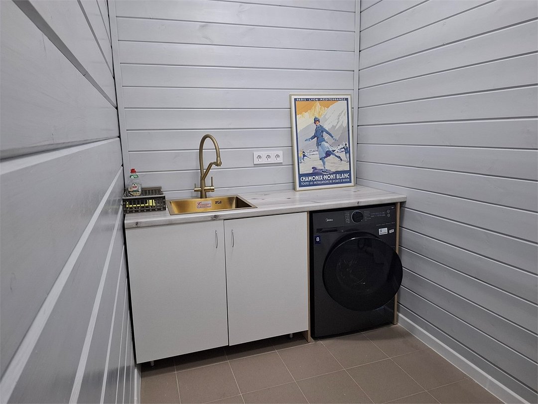 В коттедже - 6 основных мест, 2 дополнительных места. Первый этаж: гостиная с дровяным камином, спальня с двумя односпальными кроватями, гардеробная, кухня, сушильный шкаф для одежды, сауна, санузел с душем; Второй этаж: спальня с 2 односпальными кроватями и спальня в двуспальной кроватью, санузел, балкон.Услуги и удобства