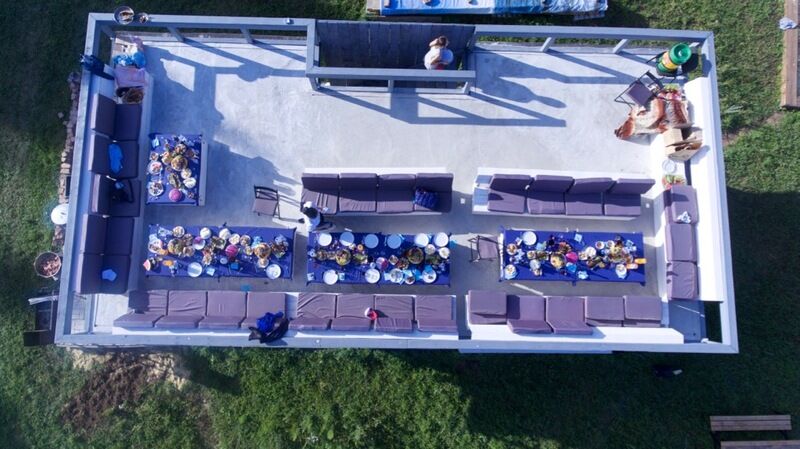 Читать полностьюБеседка с уличной кухней белого дома (вместимость 18 человек/столы/скамейки/сервировка/обслуживание):