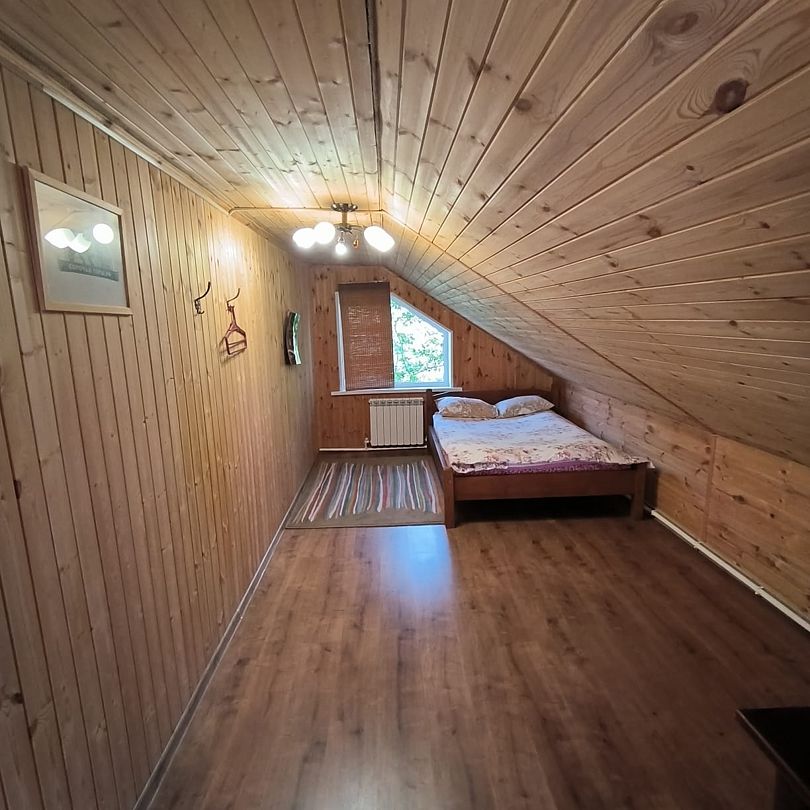 Дом Охотника оформлен в охотничьем стиле, здесь на стенах чучела куницы, кабана, лося и беркута. В доме на первом этаже везде теплый пол, камин, зал для банкета до 30 человек, душ, удобства. На втором этаже три комнаты, по 2-3 двуспальные кровати в каждой комнате. Всего 14 спальных мест.