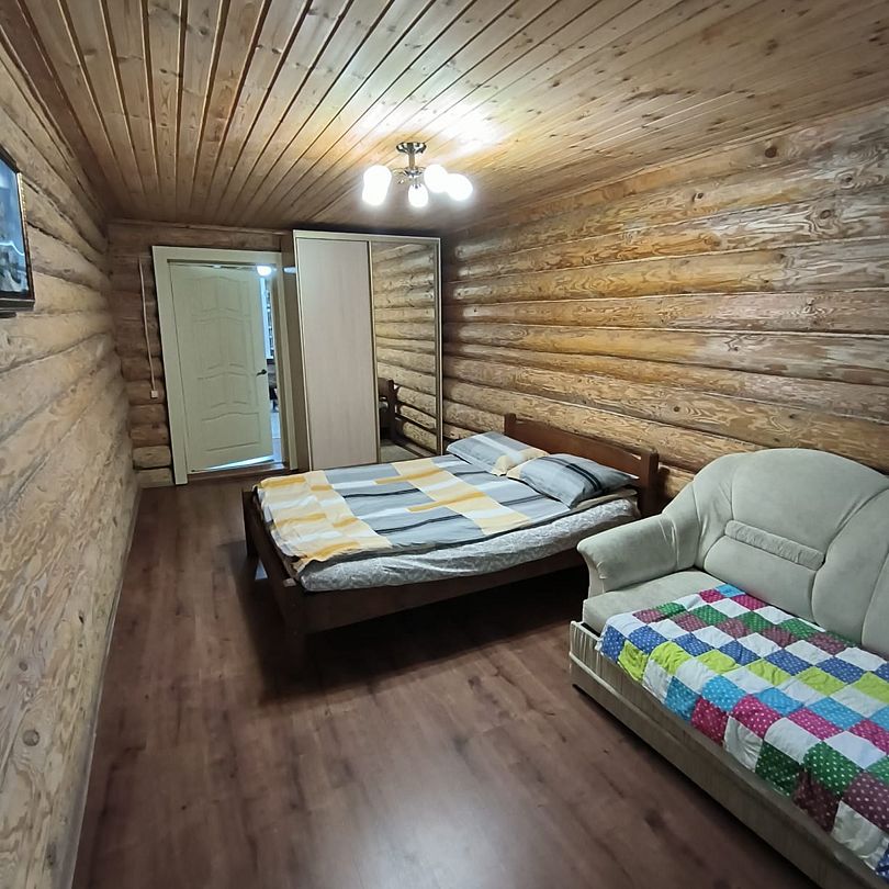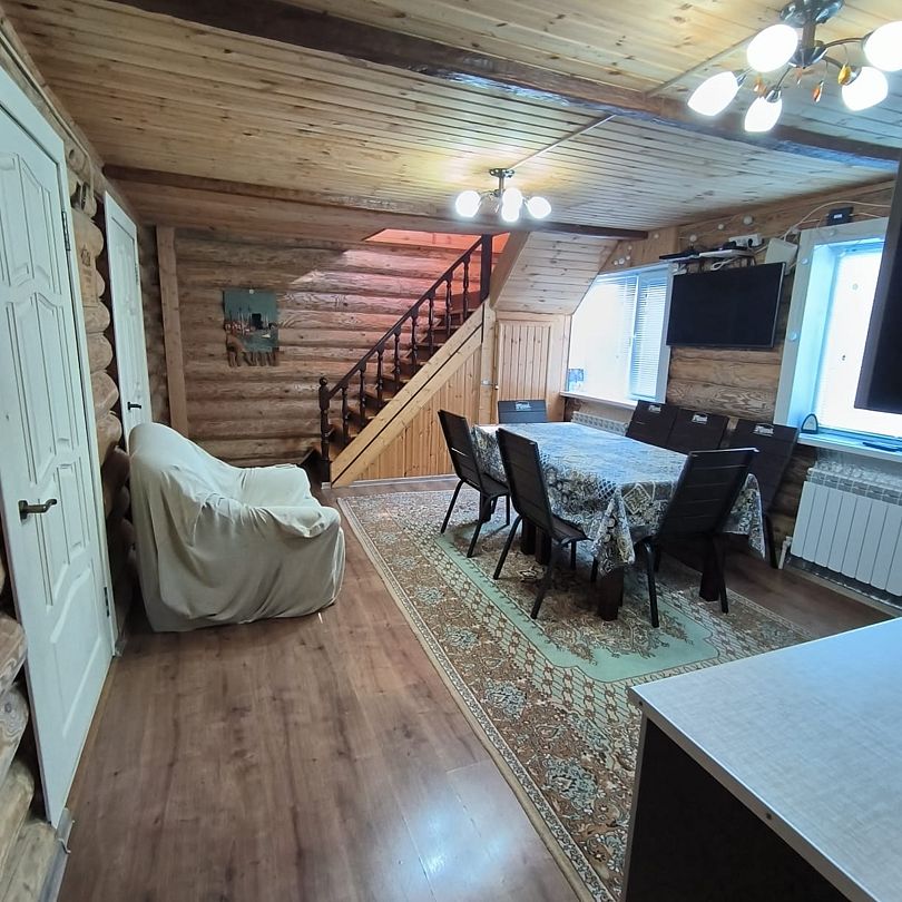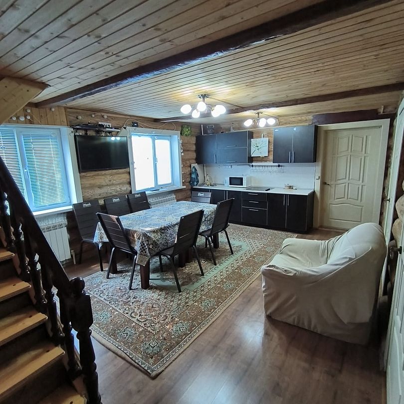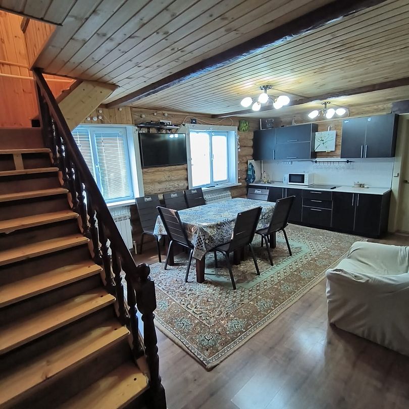 Дом в шаговой доступности до реки Кама. В этом доме пять комнат с двуспальными кроватями, пятая комнаты второго этажа с большим диваном.