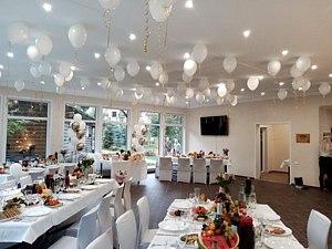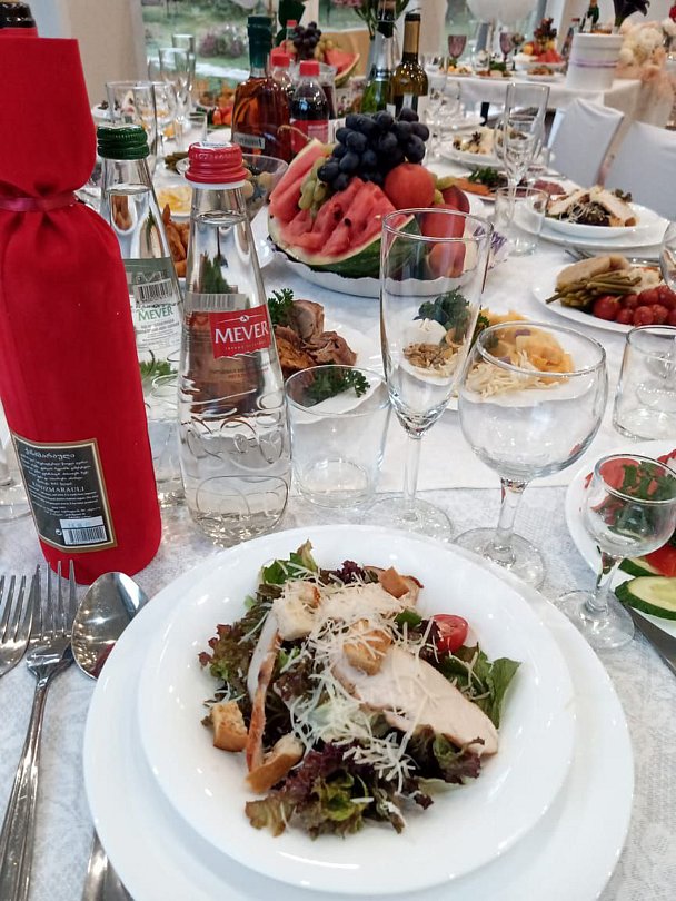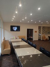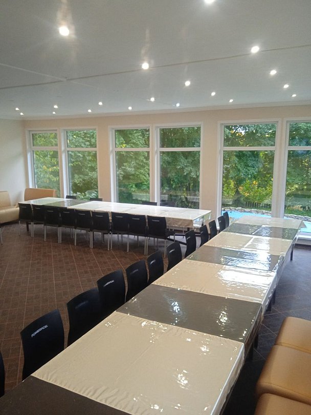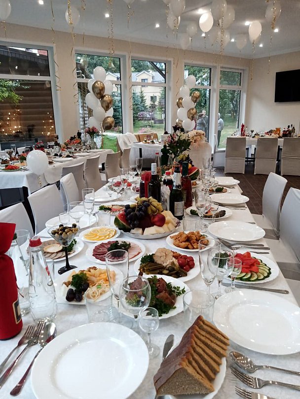 Гостиница сдается вместе с банкетным залом на 65 человек, на улице можно накрыть столы на 100-120 человек, еда качественная, из натуральных местных продуктов.