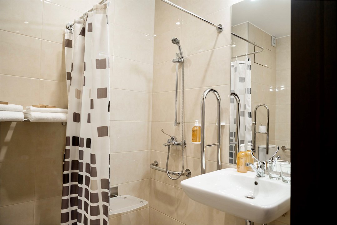 Номер для маломобильных групп населения. В номере 2 односпальных места: полутороспальная кровать 120 см х 200 см и раскладная кровать, мебель, сейф, кондиционер, чайная станция, мини-холодильник, выход на индивидуальную террасу.