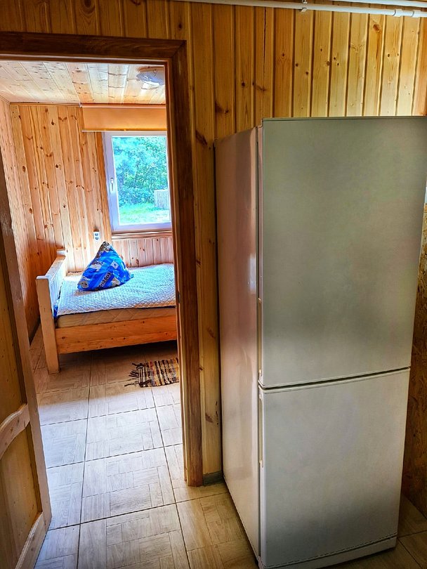В номере есть мини холодильник. Общая кухня (холодильник, плита). С/у в доме.