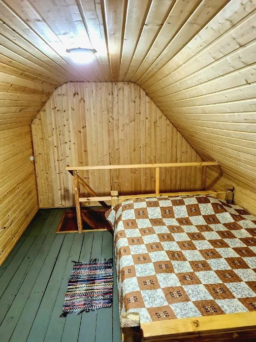 В доме имеется 6 комнат на 12 спальных мест.Так же внутри дома есть баня, снаружи которая не только выглядит, но и выполняет функции русской печи, на которой тоже могут разместиться до 8 человек. Беседка и мангал включены в стоимость.