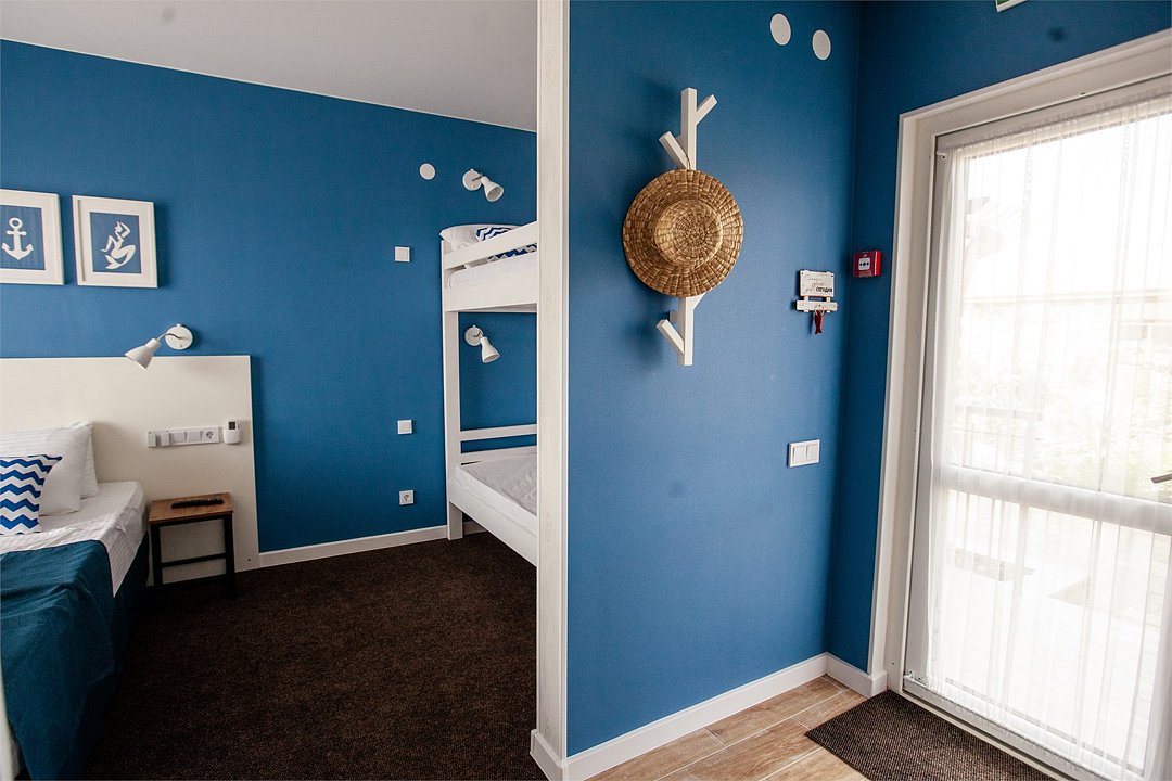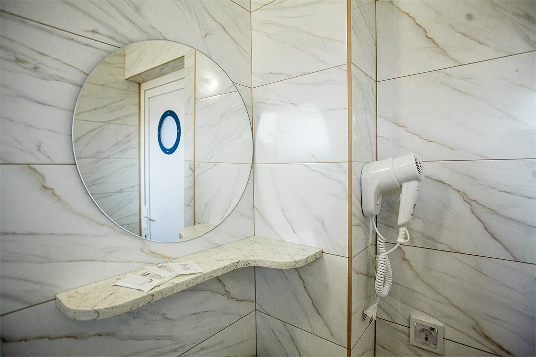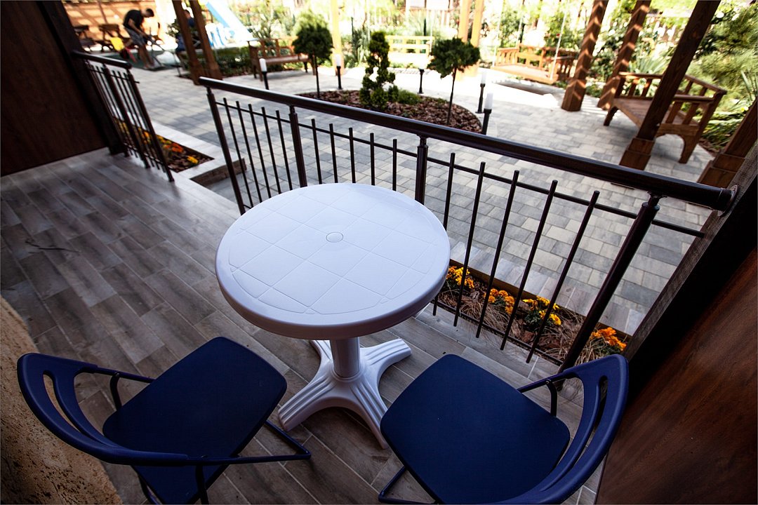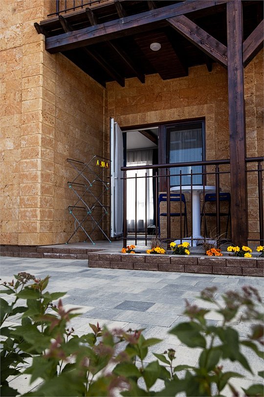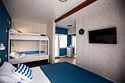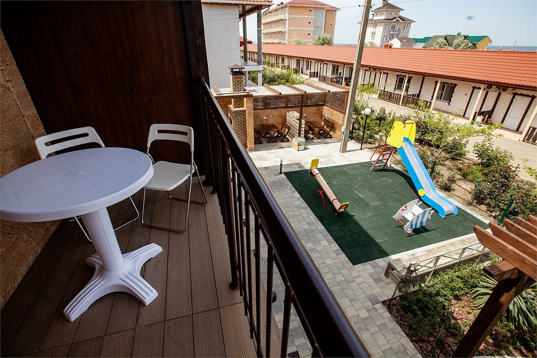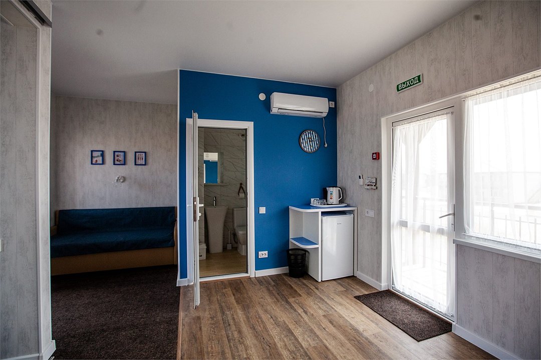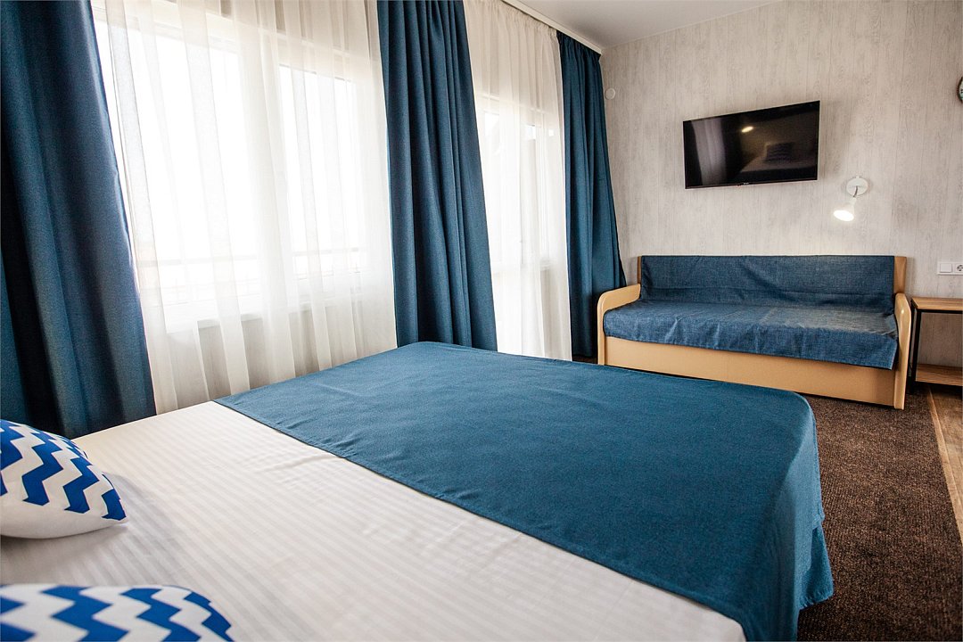 Однокомнатный номер площадью 26 кв метров с отдельным входом в номер и балконом. Оборудован двуспальной кроватью / 2 односпальные кровати, двухъярусной кроватью, телевизором с функцией Smart TV, wifi, кондиционером, электрическим чайником, холодильником, сейфом и феном, утюгом и гладильной доской. С/у в номере (душевая зона без поддона, умывальник, унитаз, фен) Вид из окон на бассейн, на территорию, боковой вид на море и частично на Розовое озеро. Номер рассчитан на комфортное размещение 4 человек. Размещение на доп местах не предусмотрено. 4 основных места. Номер расположен на 1 этаже.Услуги и удобства