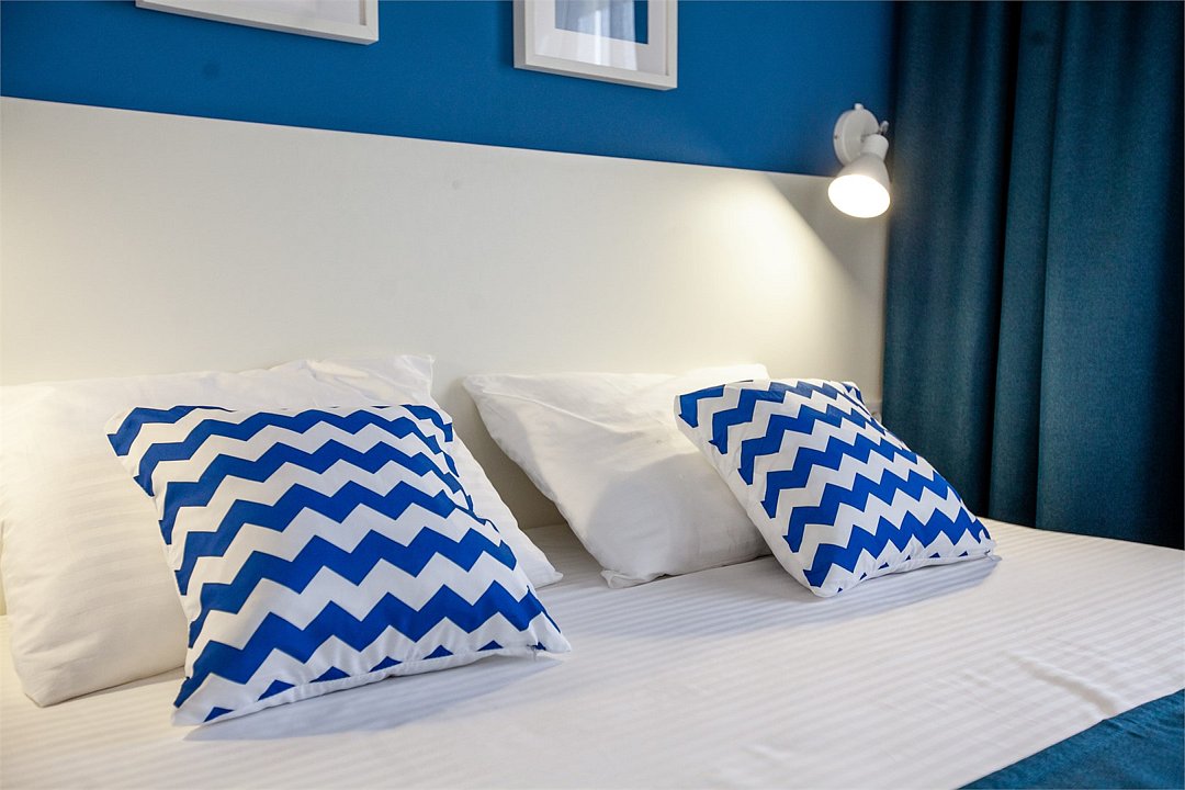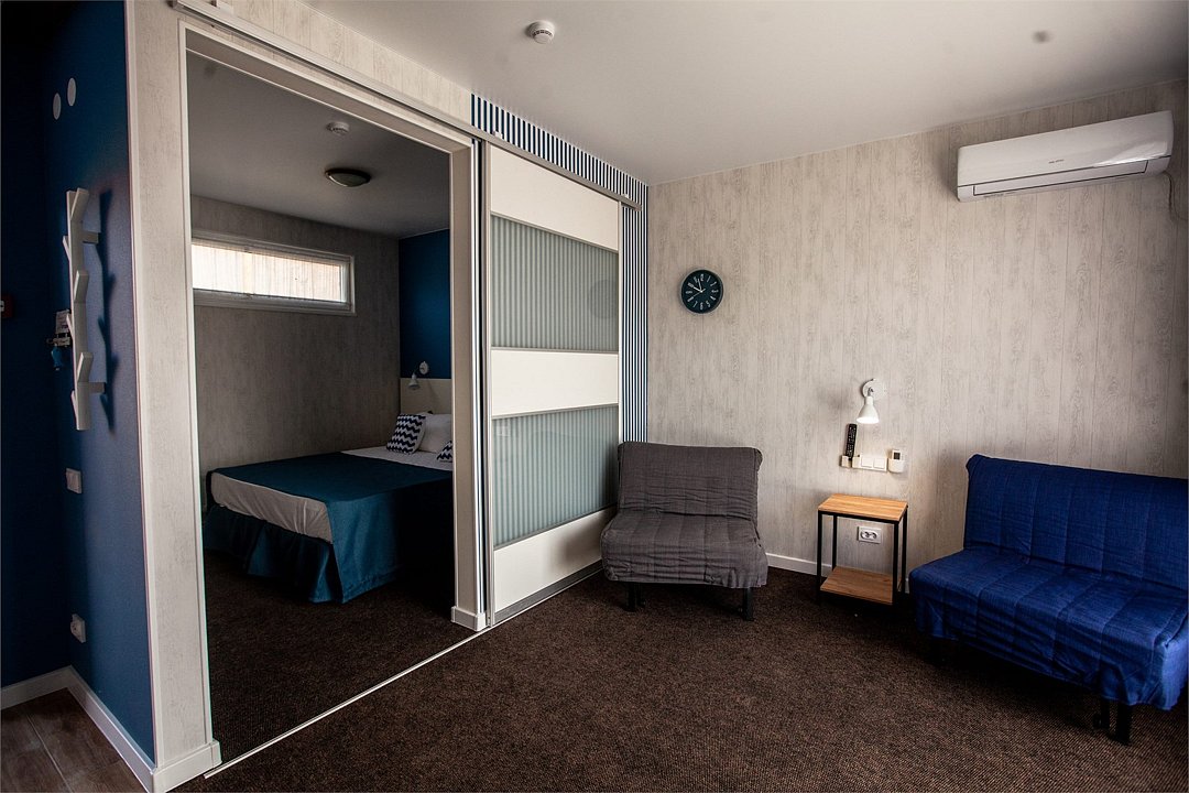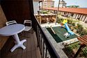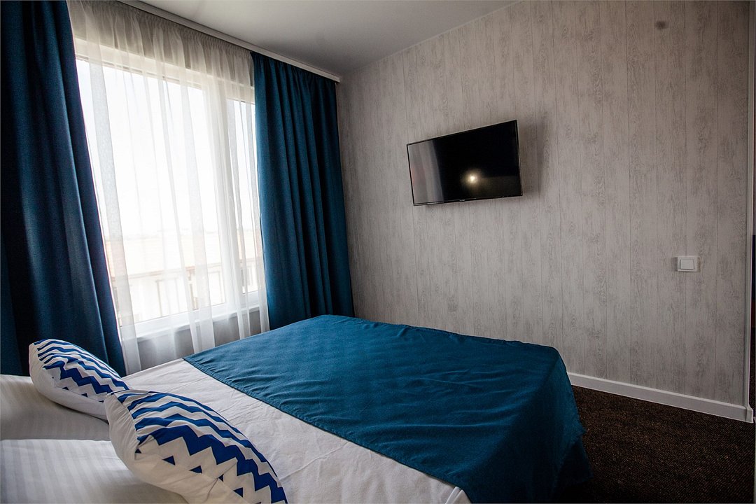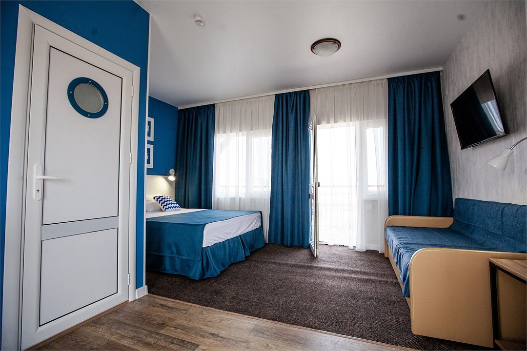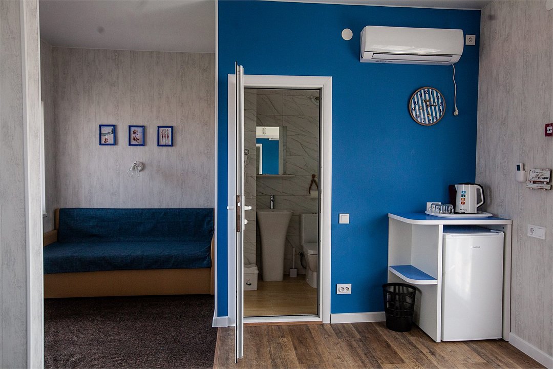 Однокомнатный номер площадью 20 кв метров с отдельным входом в номер и выходом на балкон. Оборудован двуспальной кроватью / 2 односпальные кровати, односпальным диваном спальное место 65х175 см, плазменным телевизором с функцией Smart TV, wifi, кондиционером, электрическим чайником, сейфом и феном, утюгом и гладильной доской. С/у в номере (душевая зона без поддона, умывальник, унитаз, фен) Вид из окон на бассейн и боковой вид на море и Розовое озеро. 3 основных места Номер расположен на 2 этаже.Услуги и удобства