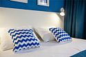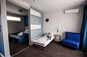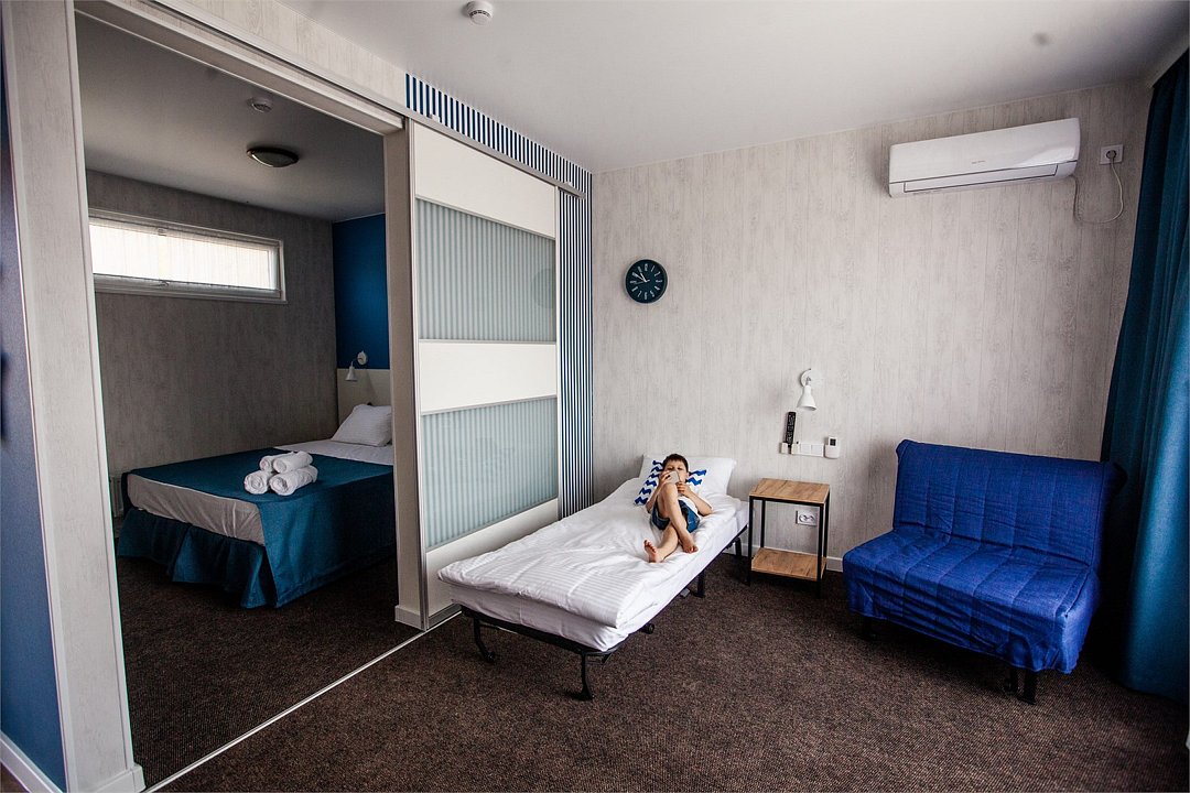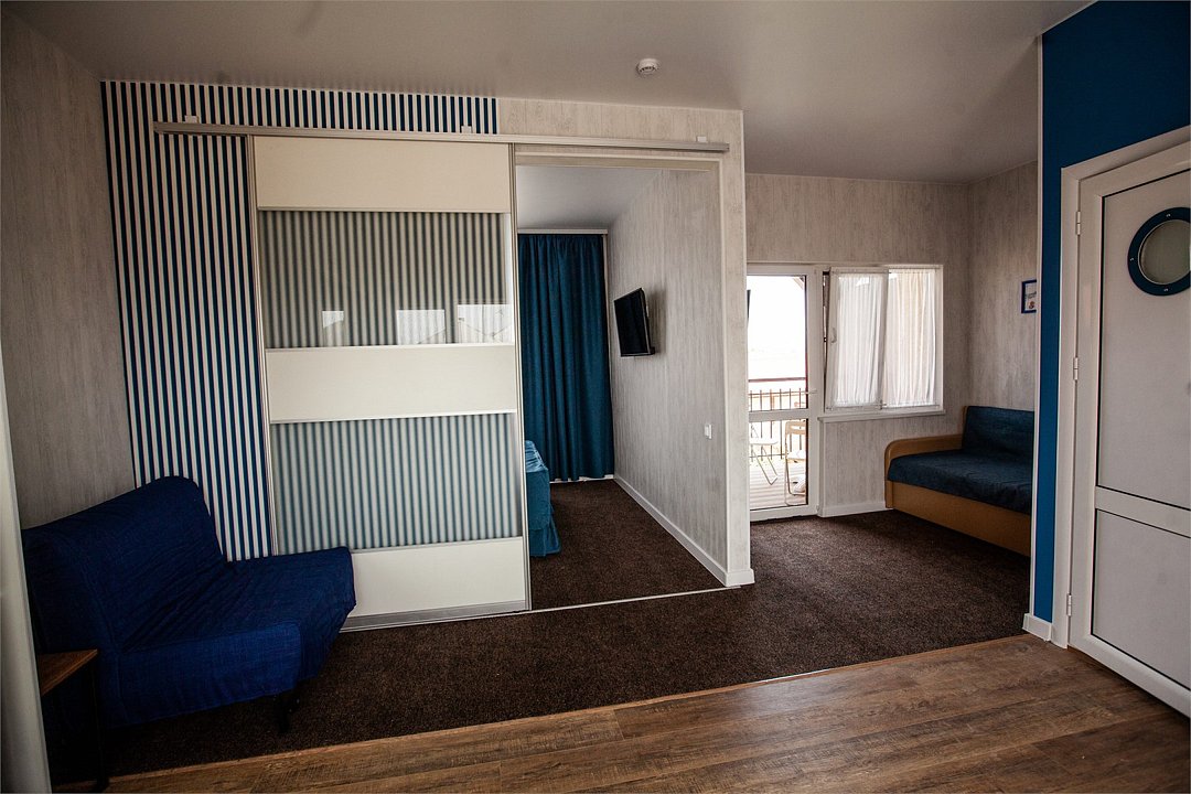 Двухкомнатный номер площадью 26 кв метров с отдельным входом в номер и выходом на балкон. Комнаты разделены раздвигающейся перегородкой. Оборудован двуспальной кроватью / 2 односпальные кровати, односпальным диваном и раскладным креслом / двумя раскладными креслами, плазменным телевизором с функцией Smart TV, wifi, кондиционером, электрическим чайником, холодильником, сейфом и феном, утюгом и гладильной доской. С/у в номере (душевая зона без поддона, умывальник, унитаз, фен) Вид из окон на бассейн и боковой вид на море и Розовое озеро. Номер рассчитан на комфортное размещение 4 человек. 4 основных места. Размещение на доп местах не предусмотрено. Номер расположен на 1-2 этаже.Услуги и удобства
