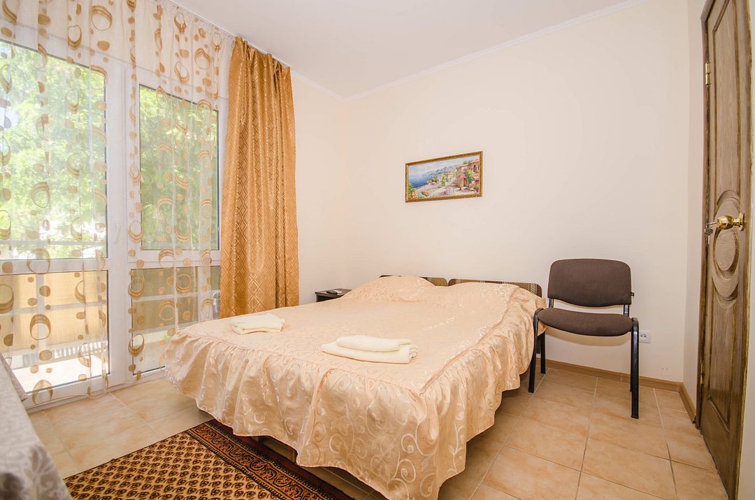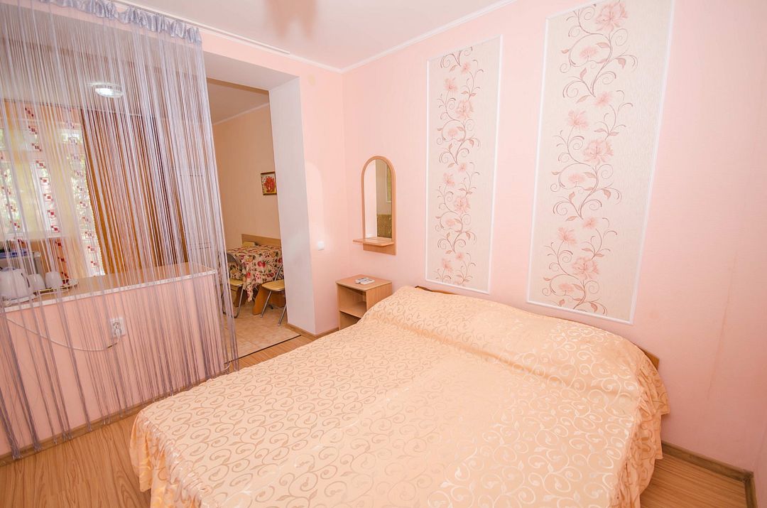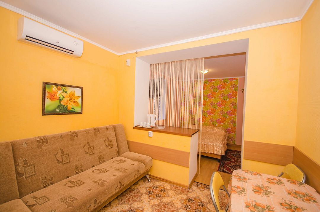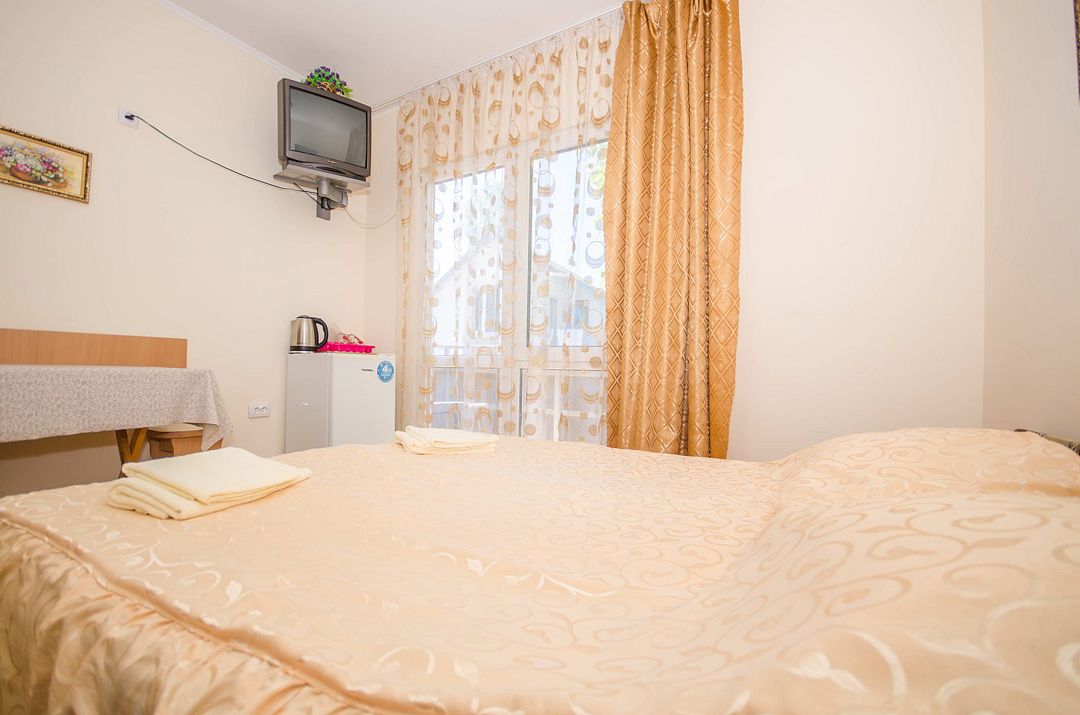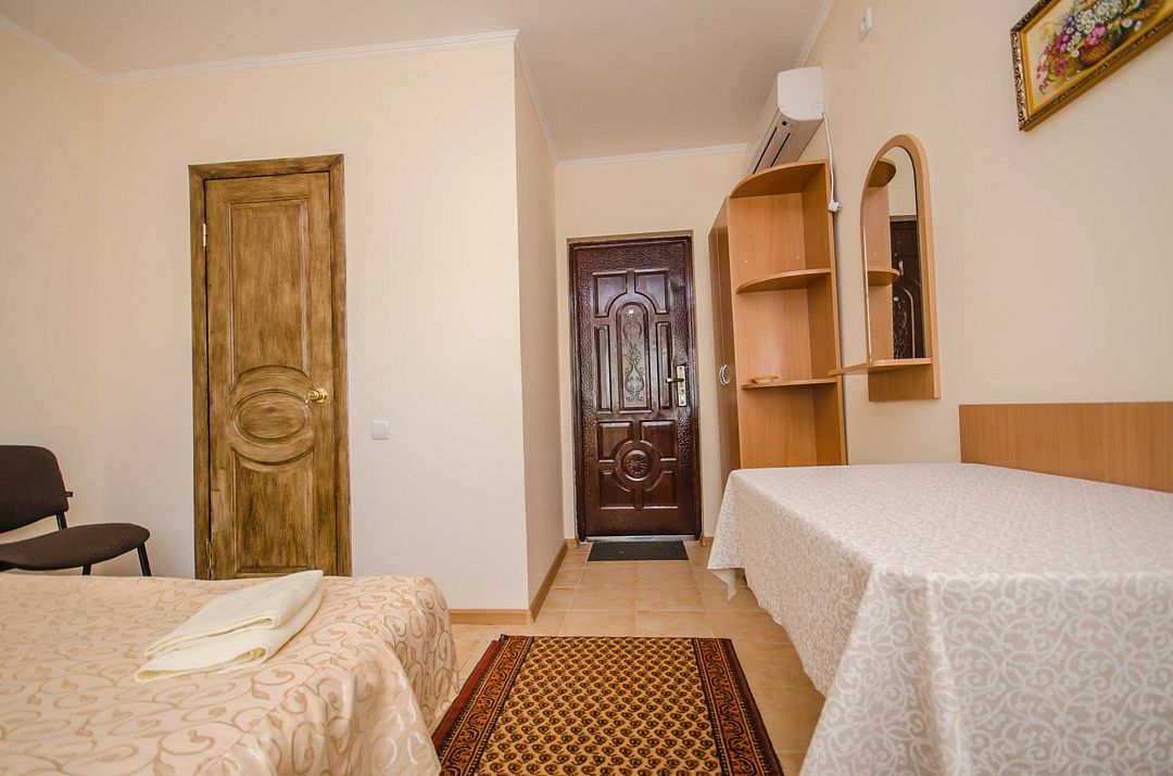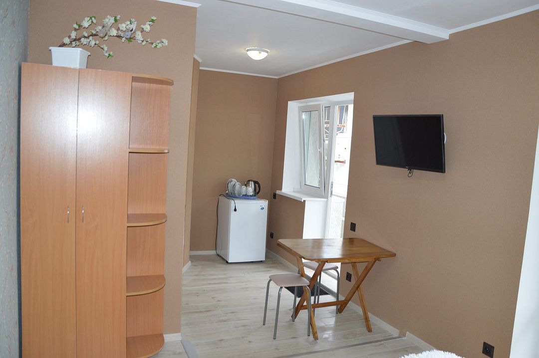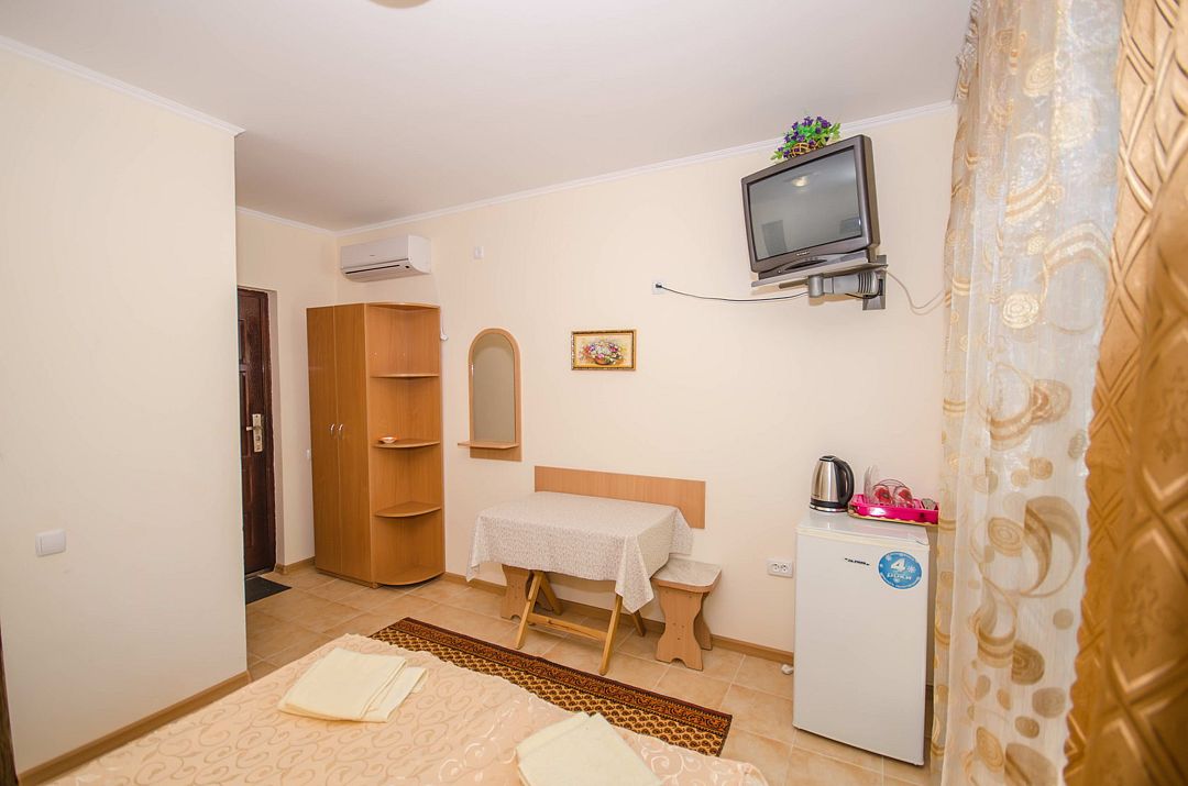 В номере: кондиционер,TV, холодильник, чайник, чашки, тарелки, ложки, столик с двумя стульями, бойлер, шкаф, 2-х местная кровать, раскладной диванчик, зеркало, тумбочка, санузел в номере, сушилка для белья.