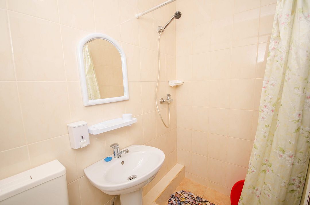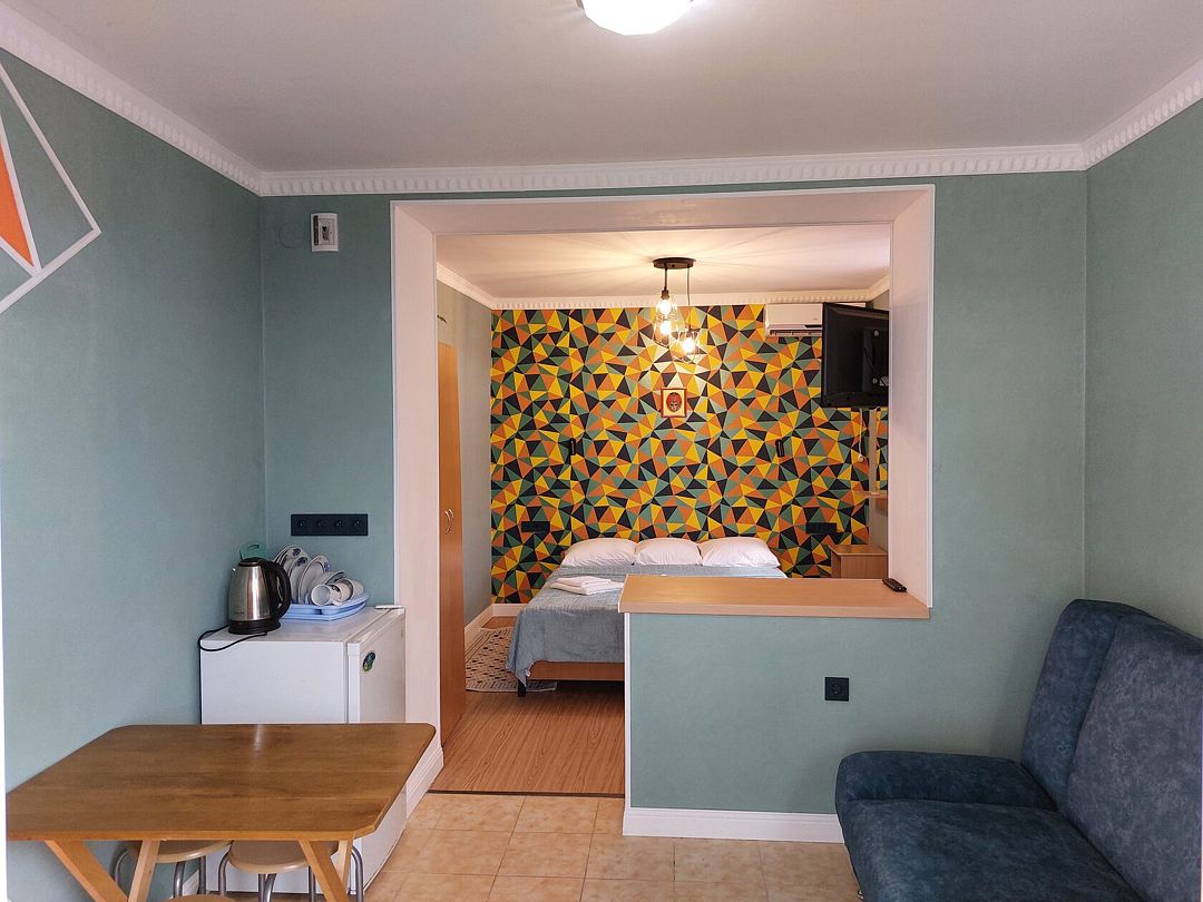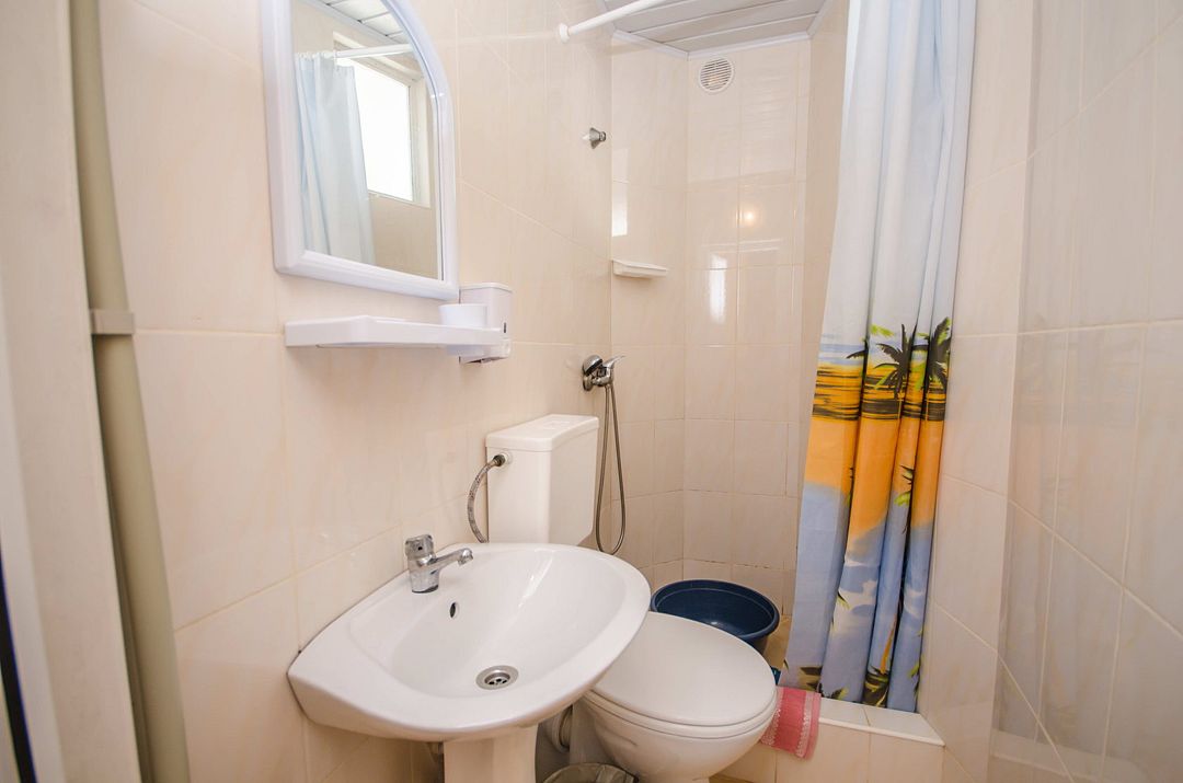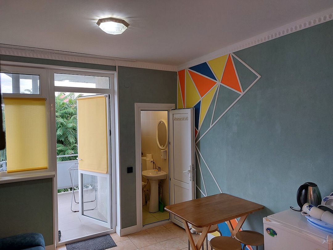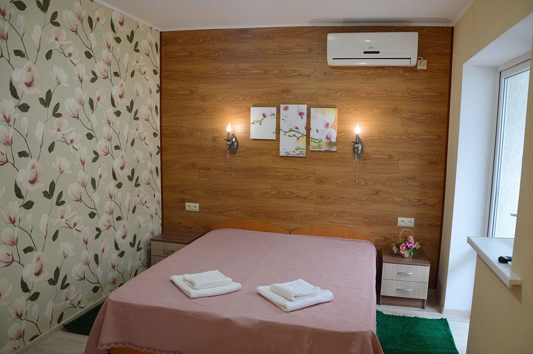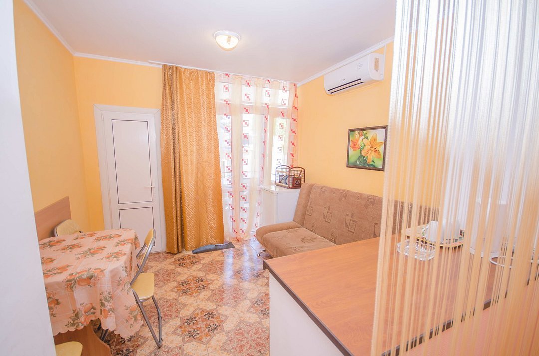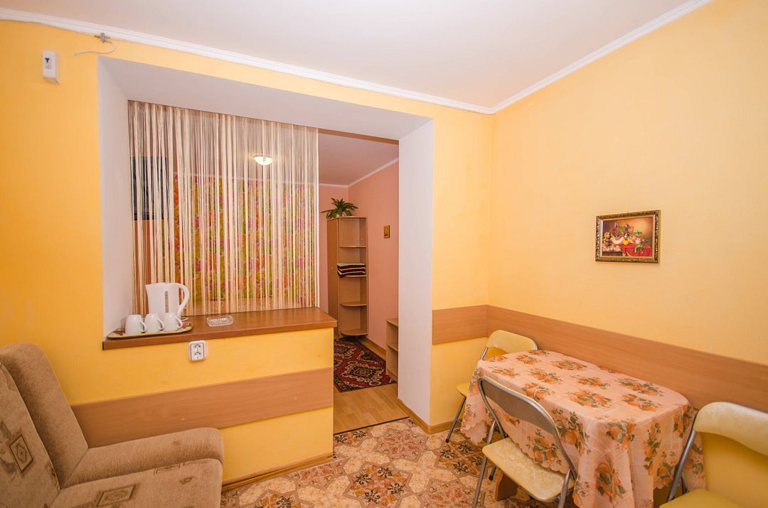 В номере: кондиционер,TV, холодильник, чайник, чашки, тарелки, ложки, столик с двумя стульями, бойлер, шкаф, 2-х местная кровать, раскладной диванчик, зеркало, тумбочка, санузел в номере, сушилка для белья.