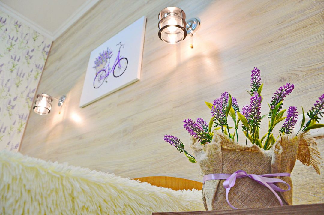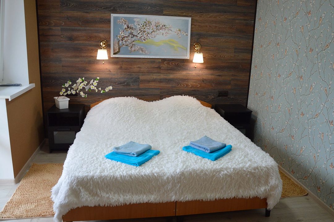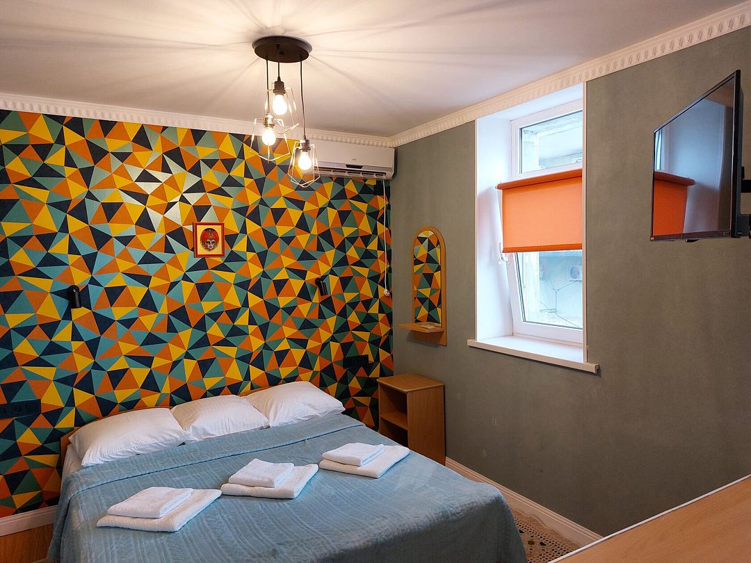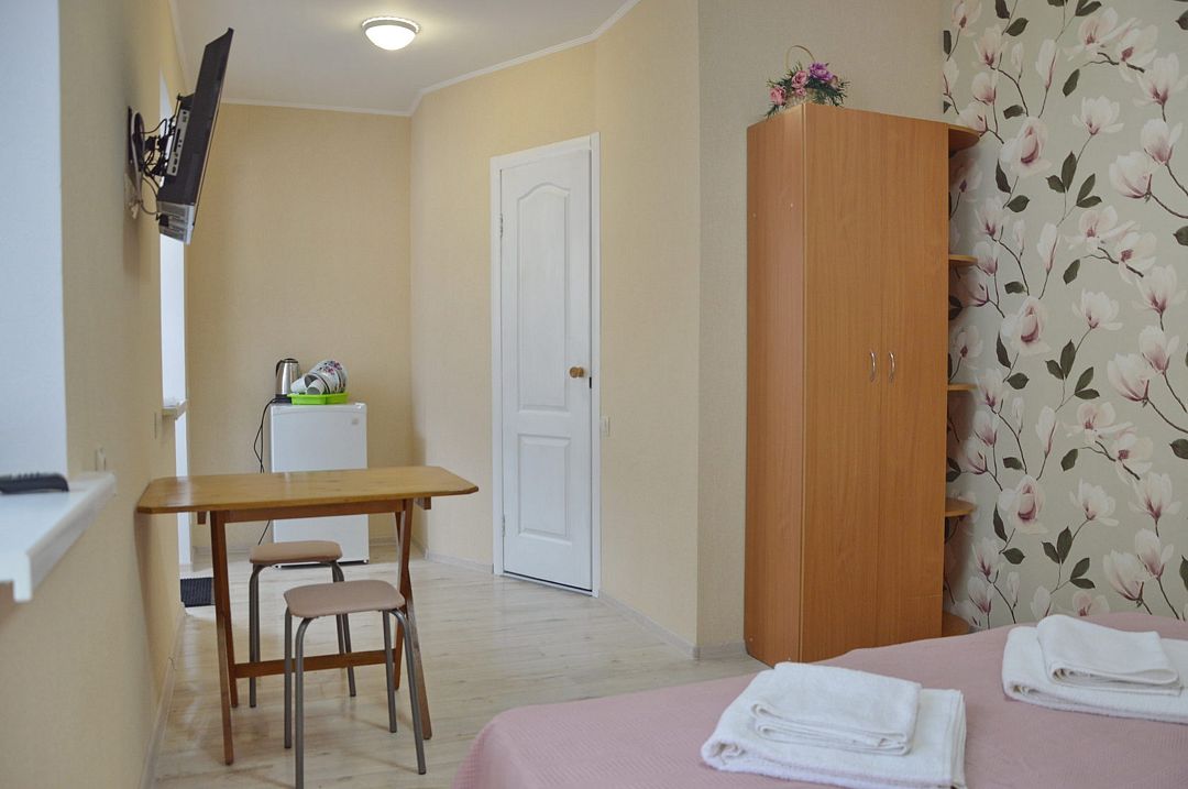 В номере: кондиционер,TV, холодильник, чайник, чашки, тарелки, ложки, столик с двумя стульями, бойлер, шкаф, 2-х местная кровать, зеркало, тумбочка, санузел в номере, сушилка для белья.