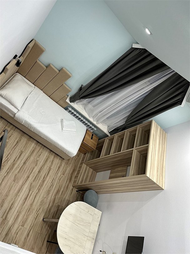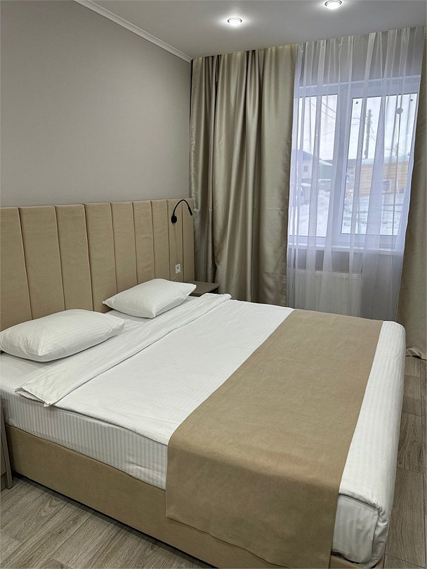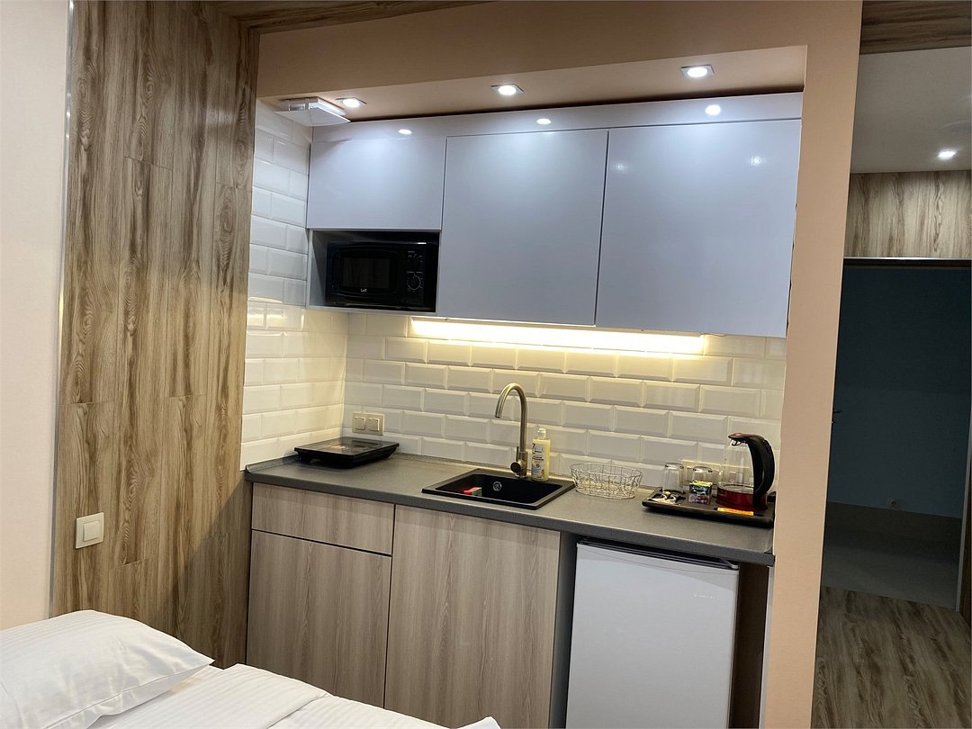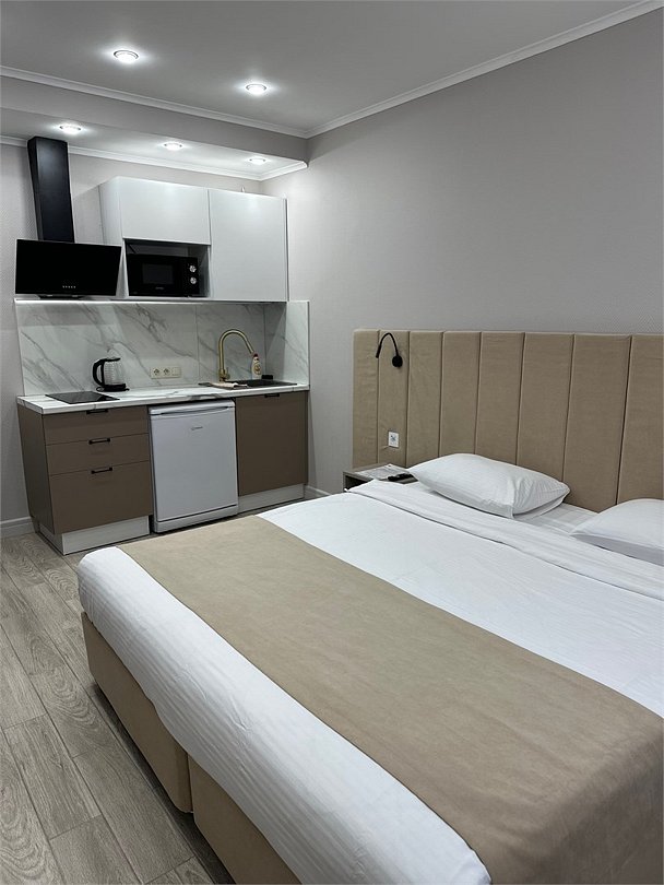 Двухместный номер категории комфорт. В номере имеется всё для комфортного проживания. Одна большая двуспальная кровать. Есть кухонная зона. По запросу предоставляется индукционная плита. Высокоскоростной интернет.Услуги и удобства