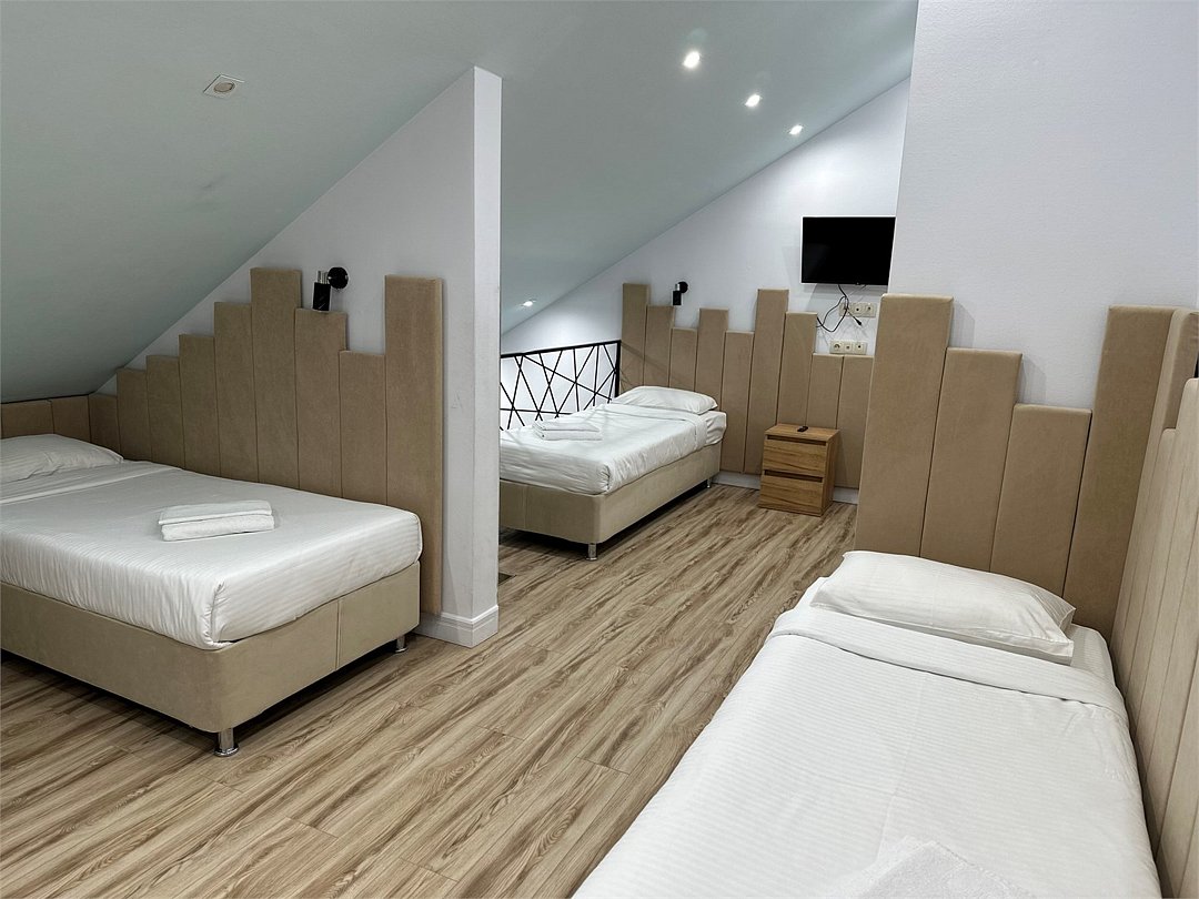 Четырёхместный двухуровневый номер. Оборудован мини-кухней. Имеется собственная ванная комната. Высокоскоростной Wi-Fi.Услуги и удобства