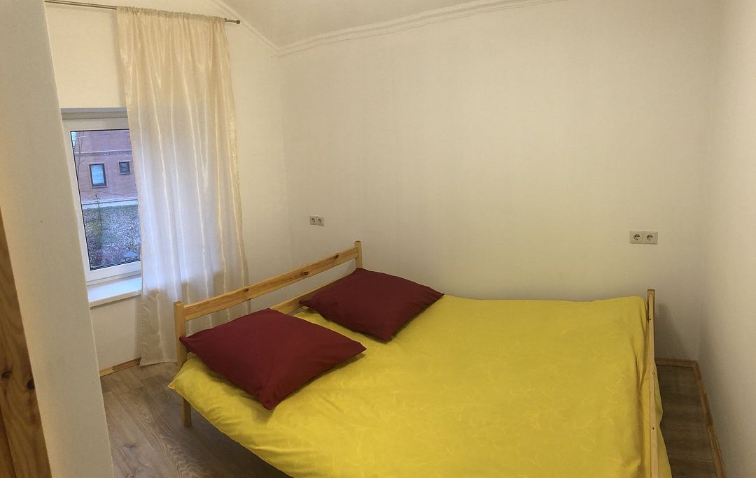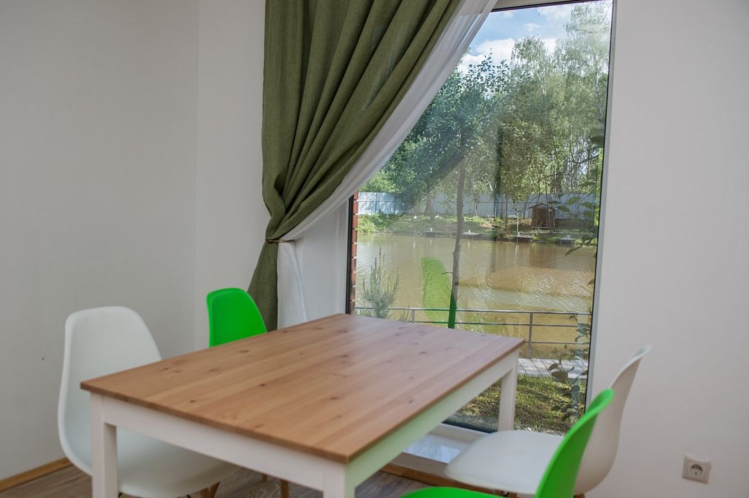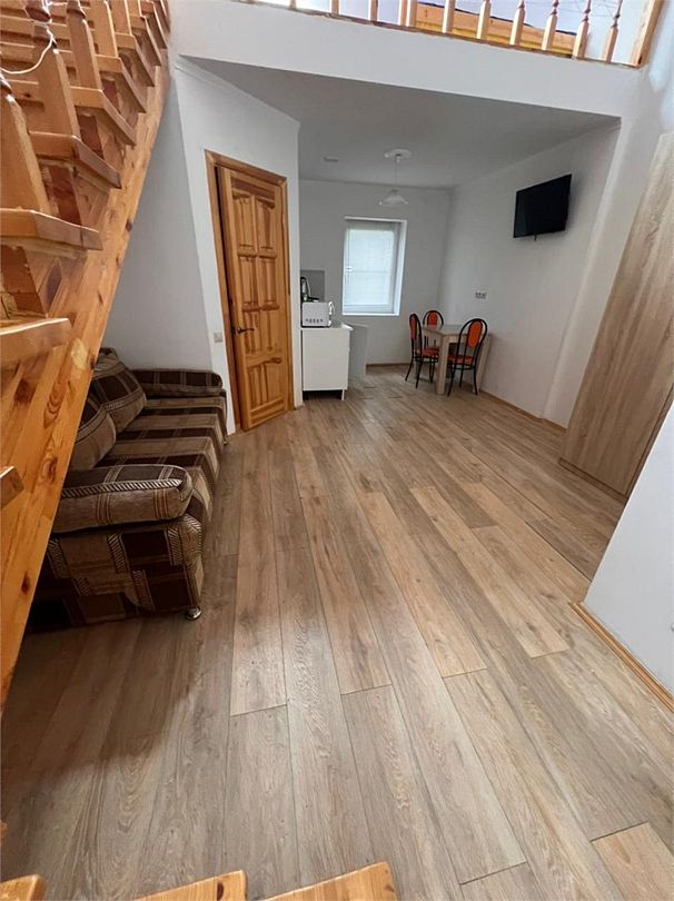 Двухуровневый домик. На 1-м этаже располагается кухня (без плиты) и зона отдыха, на 2-м этаже спальня с двумя кроватями: двуспальной и отдельной односпальной кроватью. В таунхаусе 1 санузел.