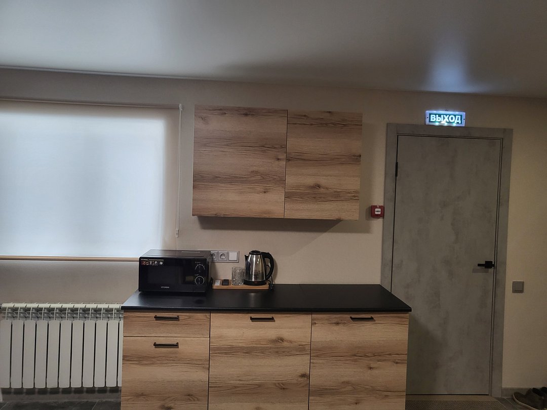 На 1 этаже имеются холодильник, микроволновка и чайник.