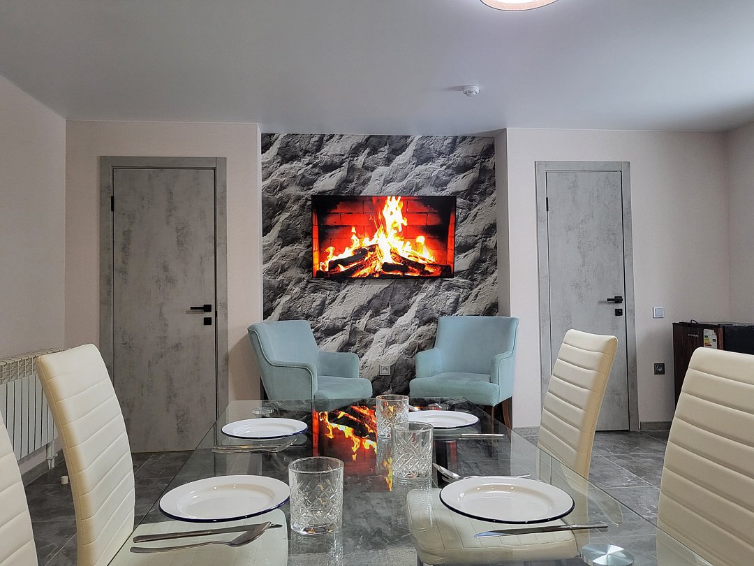 Гостей ждут уютные спальные, обеденная зона со столами и стульями, холодильник, диваны, а также две современные ванные комнаты. Для поддержания комфортной температуры в любое время года коттедж оборудован сплит-системой.