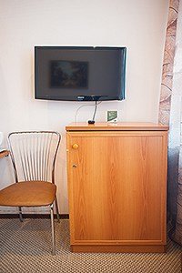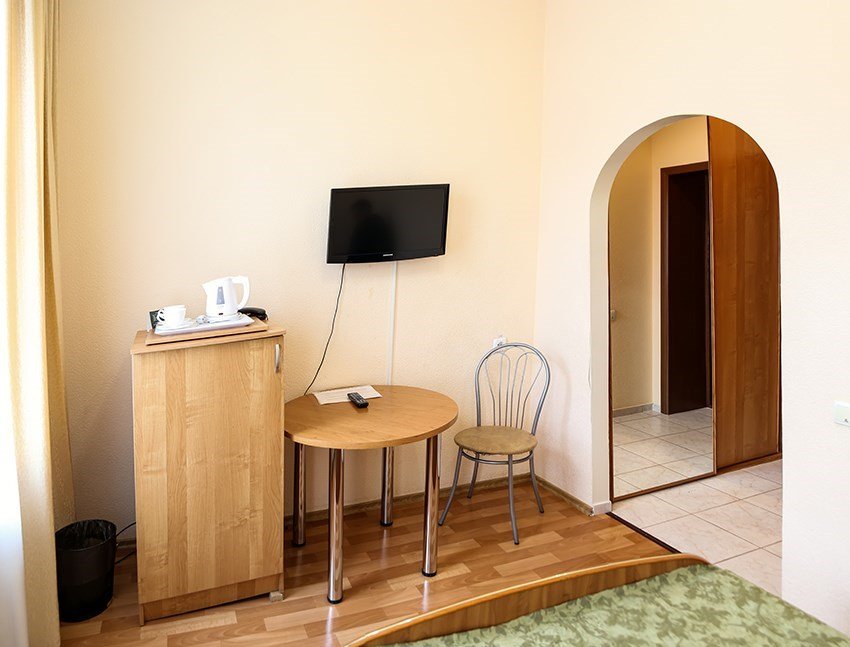 телевизор, Wi-Fi, телефон, холодильник, электронные замки, банные полотенца, односпальная кровать, стулья, шкаф для одежды, журнальный столик, зеркало, отопление, душ, кулер на этаже, высокие потолки, тумбаВ гостиничном номере