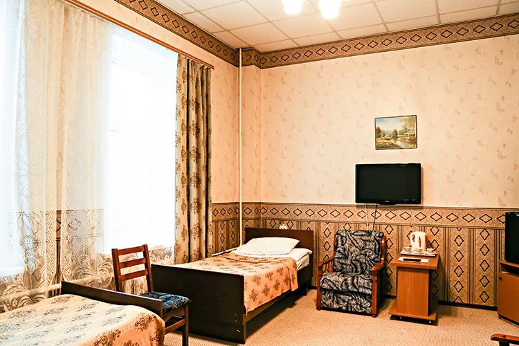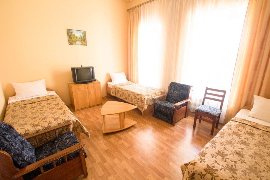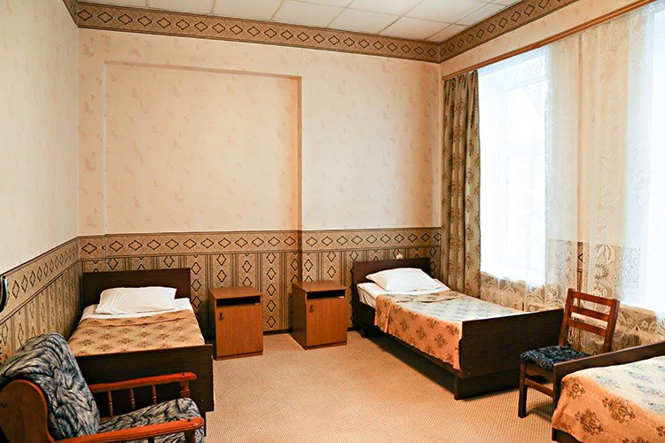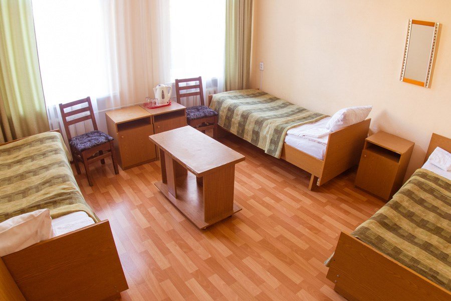 Однокомнатный трехместный номер площадью 15-18 м2. В номере три койко-места, телевизор. Санузел и три душа расположены на втором и третьем этажах гостиницы.Услуги и удобства