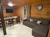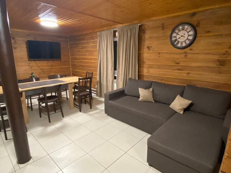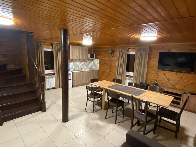* Гостиная-кухня с диваном, большим столом, посудой на 12 человек, оборудованная кухня для приготовления блюд, музыкальная колонка, телевизор.